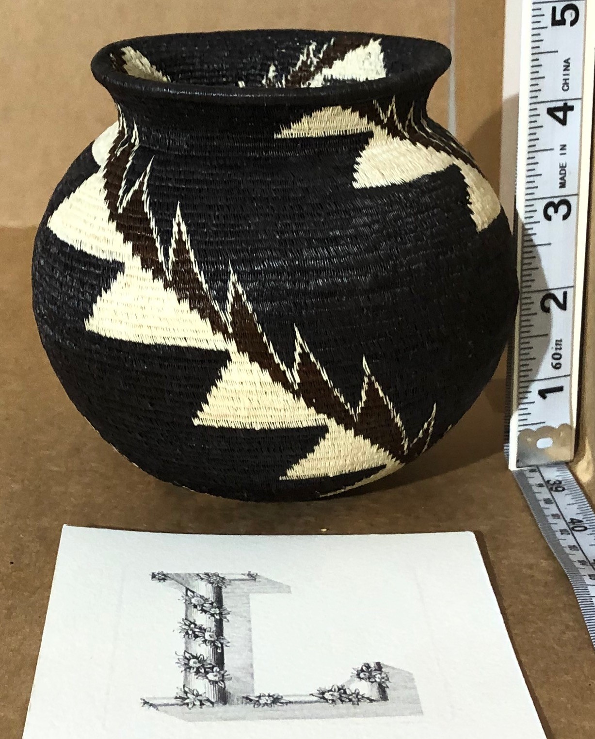 One of the finest baskets we have at the moment. Very fine stitches in the escalara pattern. Black ground with White and Red escalara pattern. This is a great basket.
