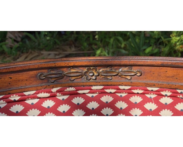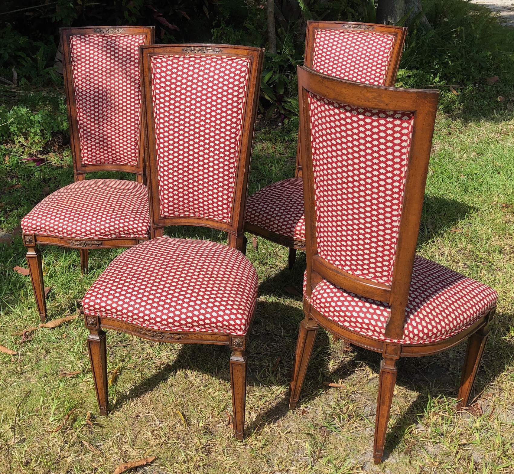 A set of four upholstered seat and back dining chairs with nicely carved detailing on the apron, back, and corners. In good condition. We ship! A soft walnut finish on the wood.