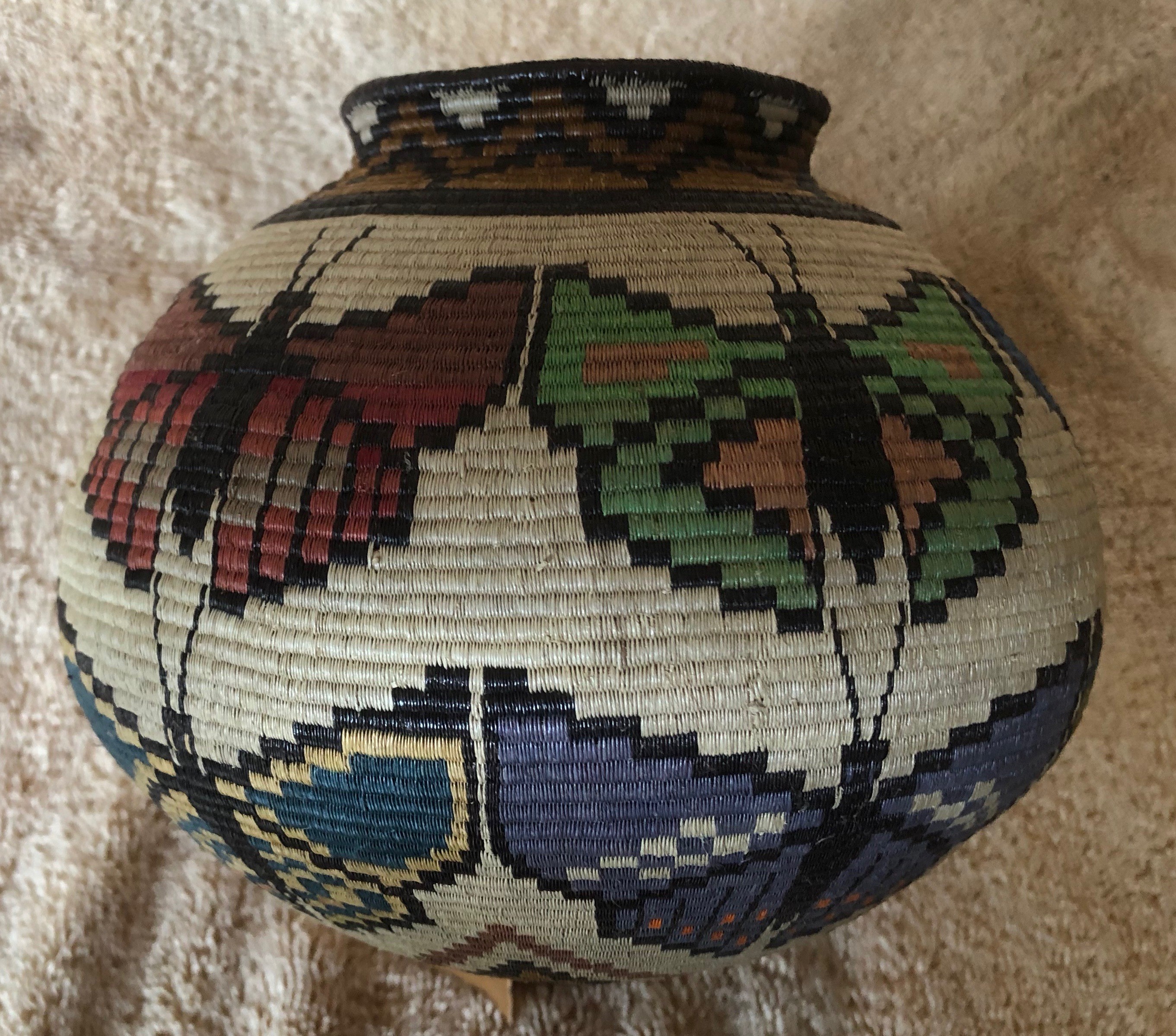20 1/2" C, 6" D, 5" tall. Great butterflies covering the basket surface. Strong color combination. NICE