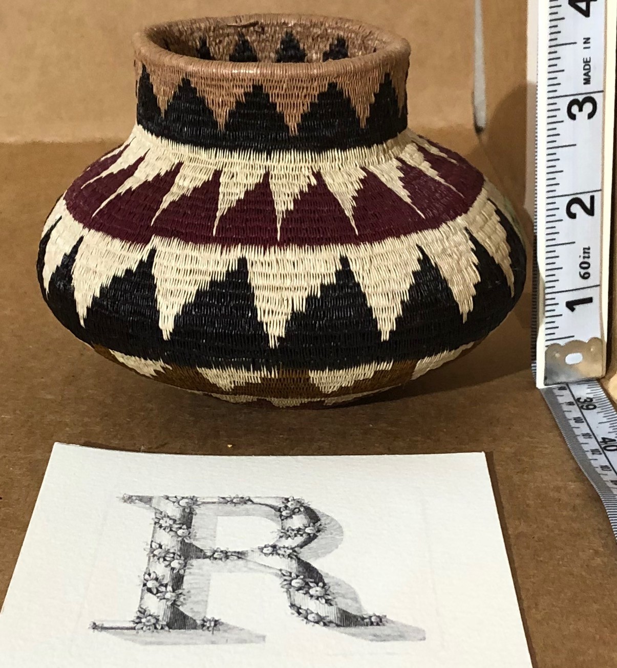 A nicely woven smaller basket of bands of colorful triangles with a staircase design on each triangle. Bands of alternating black and red triangles make a bold statement.