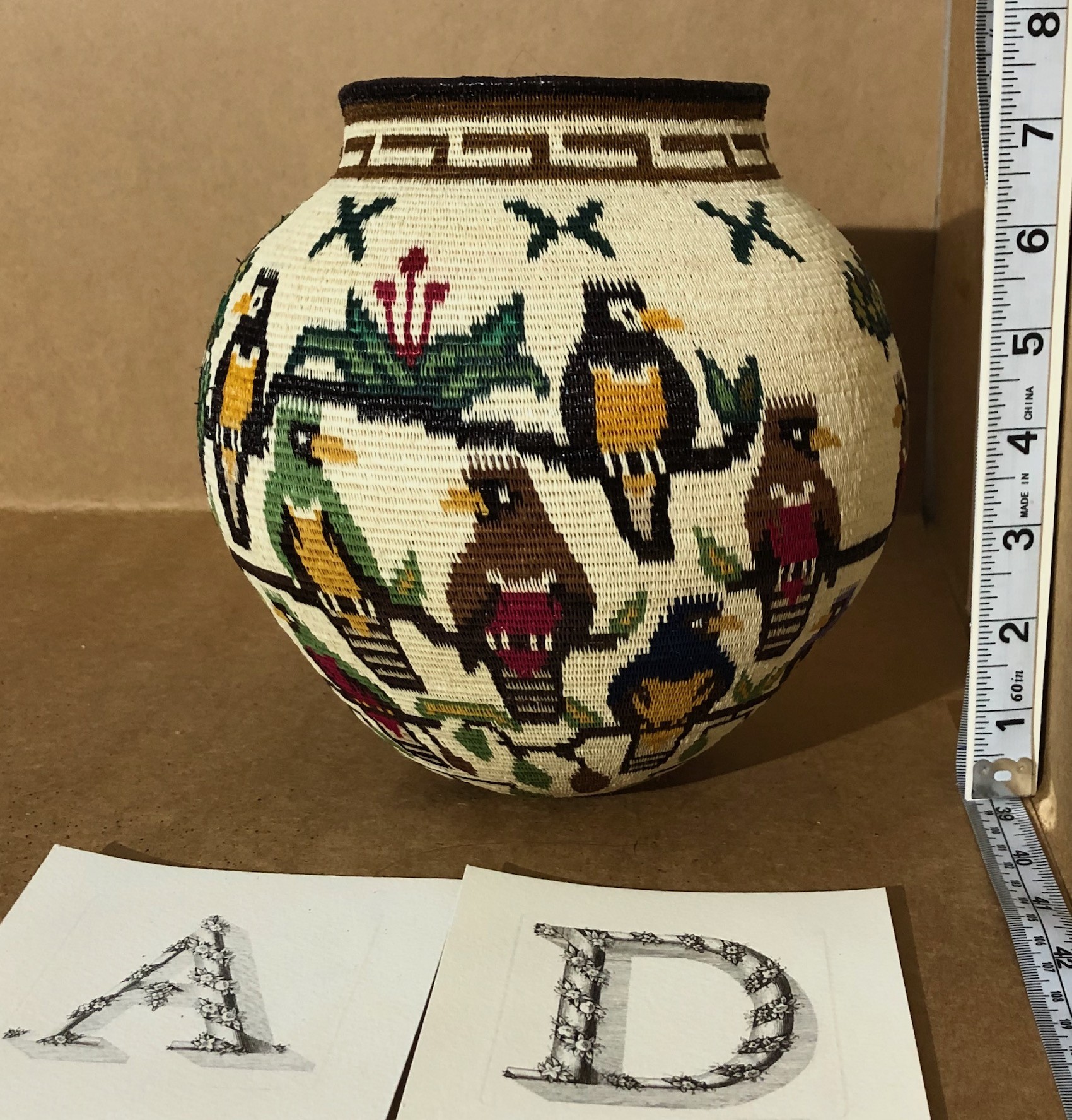A georgous, well thought out basket with a profusion of birds in a rainforest setting. One of our more colorful baskets with many birds depicted. The neck is finished in a key pattern