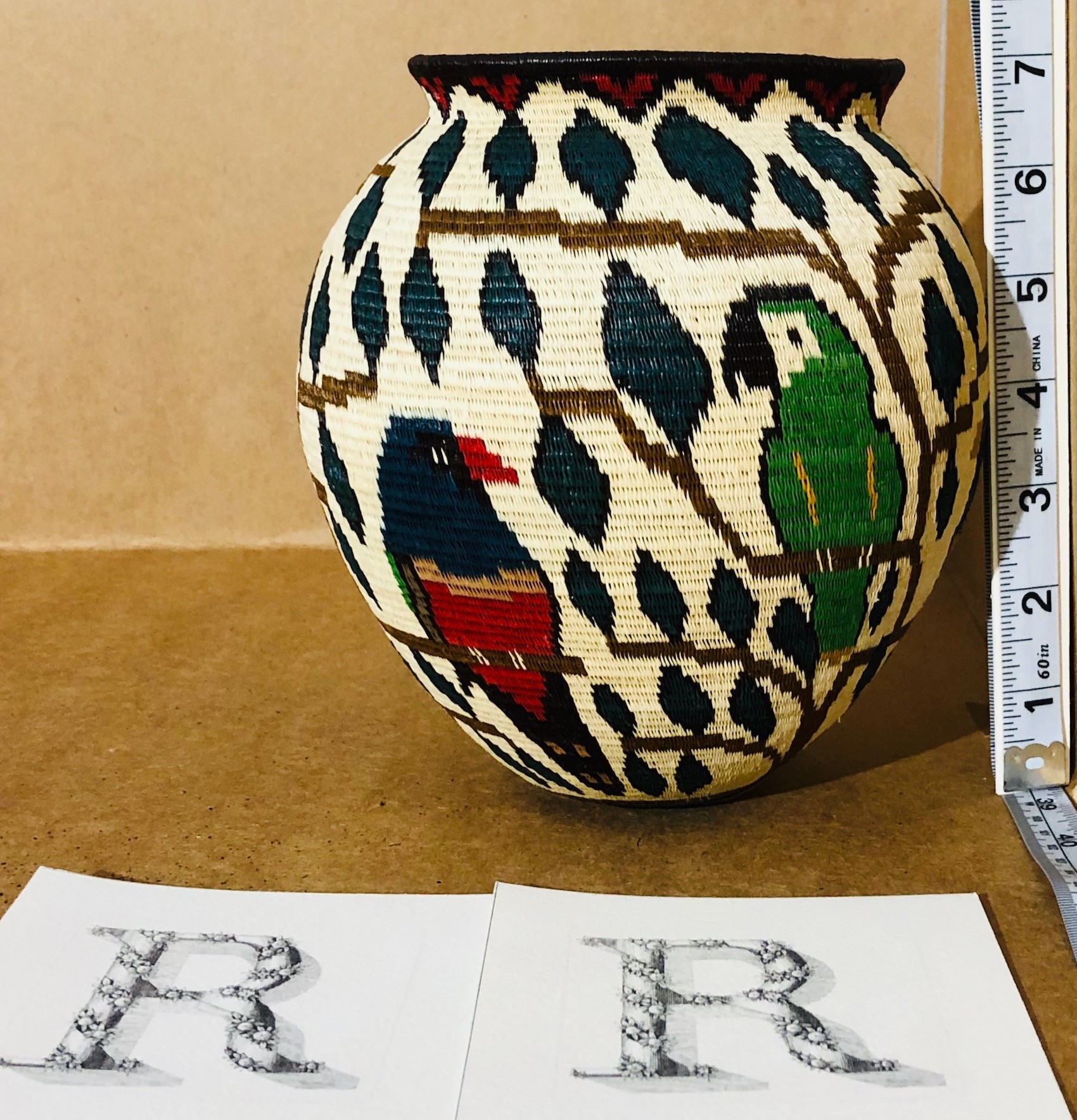 Wow. This is a beautiful basket. Clean, crisp, tight weaving of Military parrots and another bright blue tropical bird. This is a dramatic presentation. A medium siized basket with superior colors and weaving technique. One of the best.