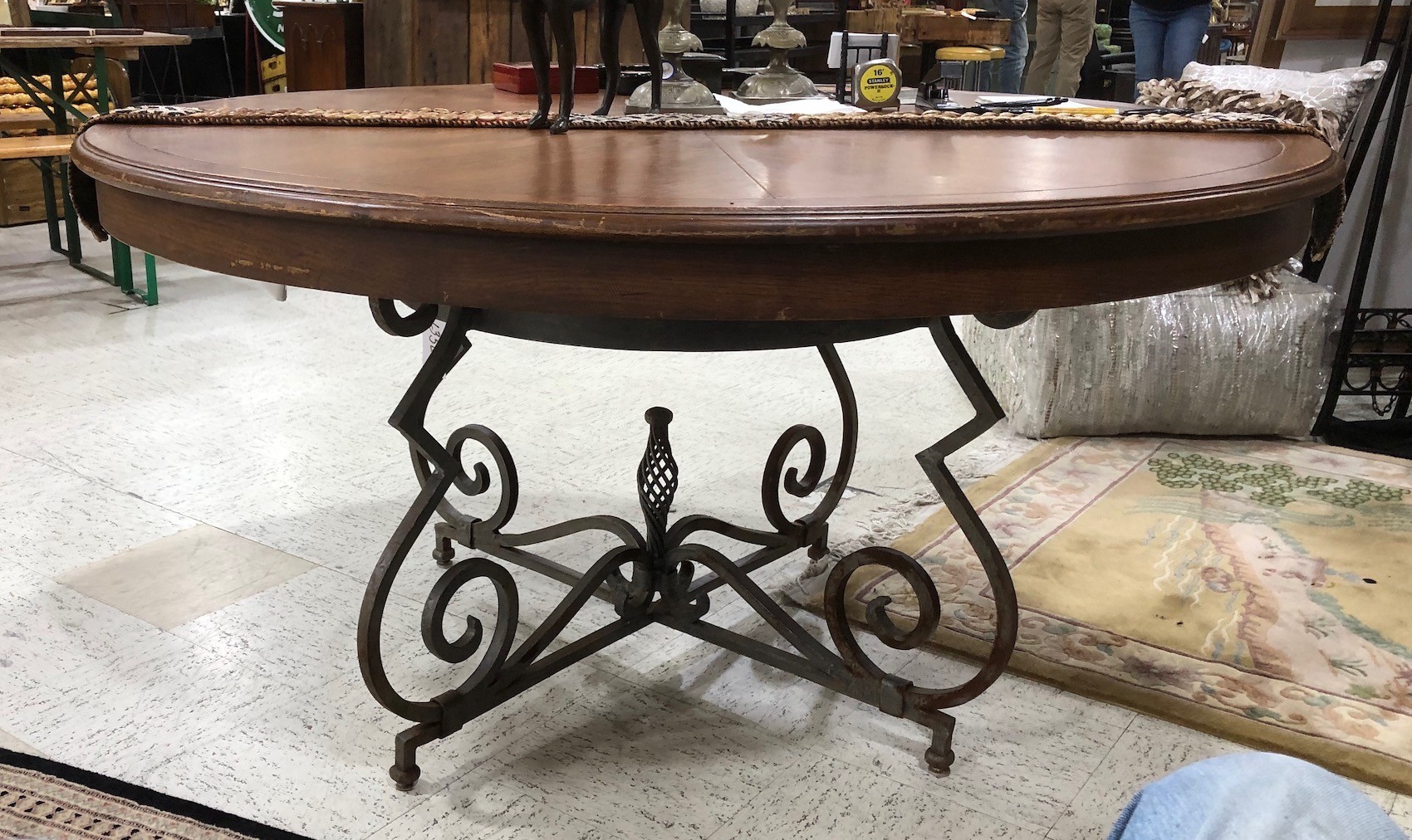 This 60" round dining table with 22' leaf was made by the Collection Reproductions company in Corpus Christi, Texas in the late 20th century. The cast iron base is intrically wrought with four scroll supports. They make their pieces one at a time to a customers order.