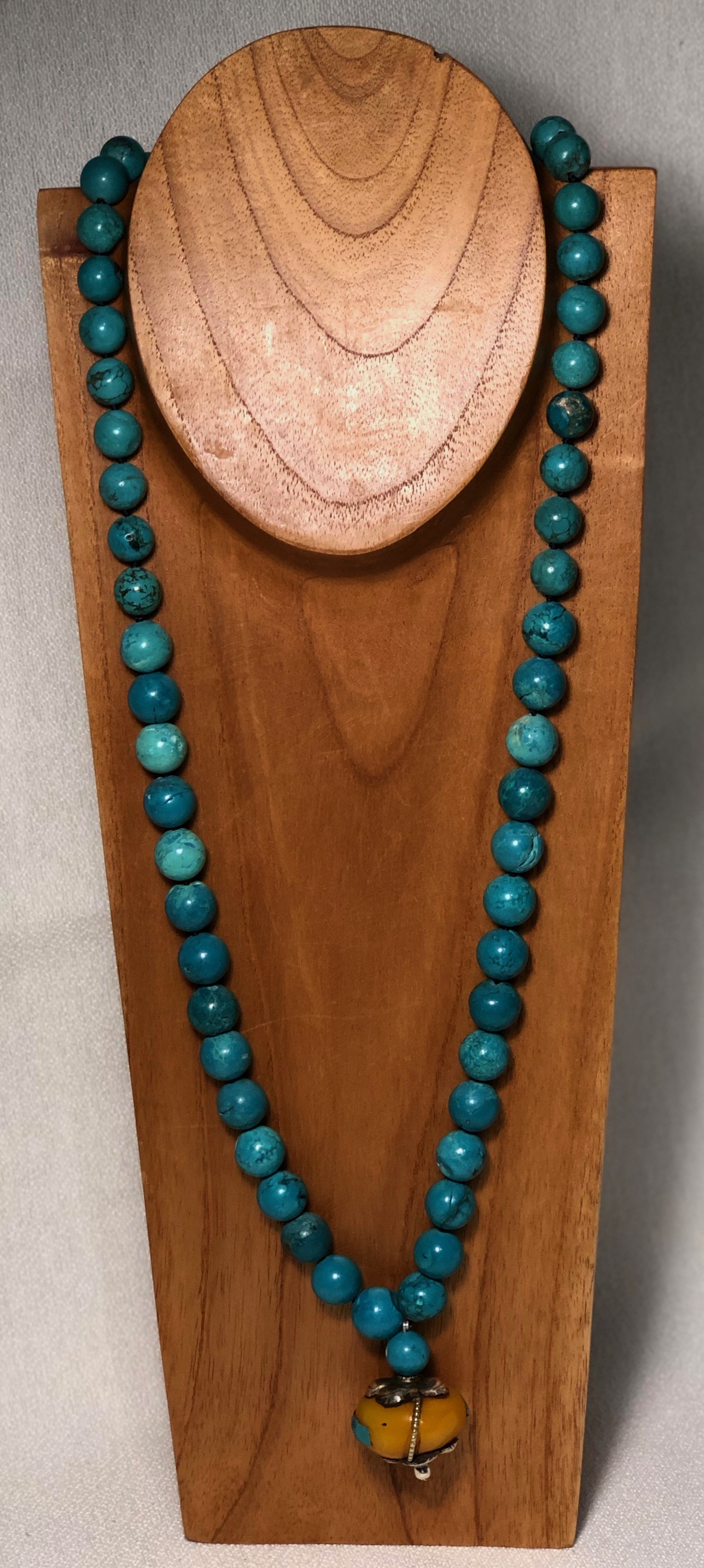 A stunning 42" strand of African turquoise with an African silve wrapped amber bead. $1500