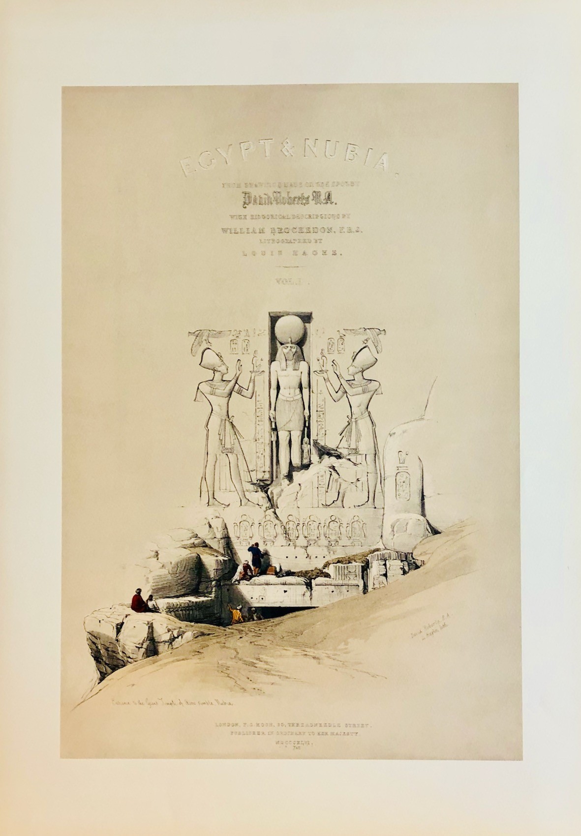 Views of Egypt, Nubia, and the Holy Land, Duo-Tone Lithograph with hand finishing. Published London 1842-49.  This set of 250 images of Egypt and the Holy Land was and is considered the greatest lithographic work of the 19th century.  Each image was first printed in b/w, then two additional printings were done in sepia, and blue or green, with several images printed a fourth time in red.  After printing, the images were hand finished by a team of water colour artists to bring the prints to a lifelike state.  If you ordered the set it would then take you 7 years to receive all 250 images.  At that time you would go to your bookbinder and have the prints bound as you wished.  The images have always been very desirable and are becoming very rare as sets are being broken and the prints sold off.