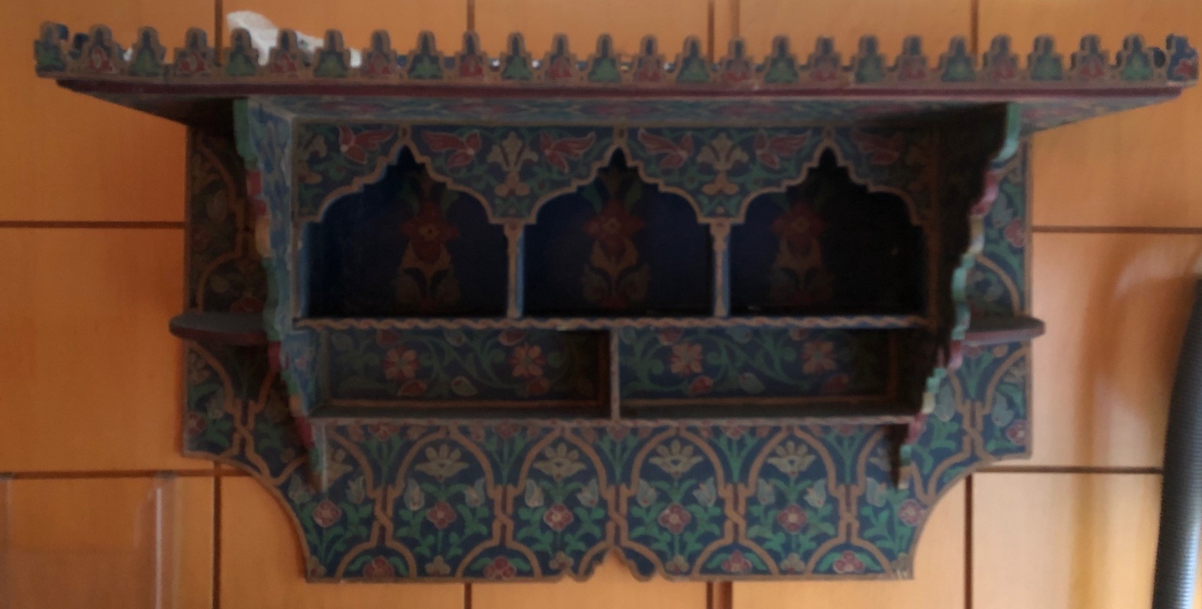 A beautifully painted hanging shelf from 19th century India. It has numerous cubby-holes for individual items to be displayed as well as a long open top shelf with scalloped edging. A lovely and unusual piece.