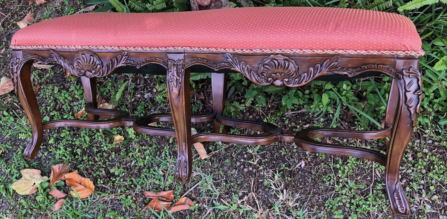 A lovely upholstered Louis Solomon, NYC bench. Recently acquired from a Palm Beach estate. 52" long. 18" wide. 18" tall. A great size. Great carving and in gently used condition. 1980's.