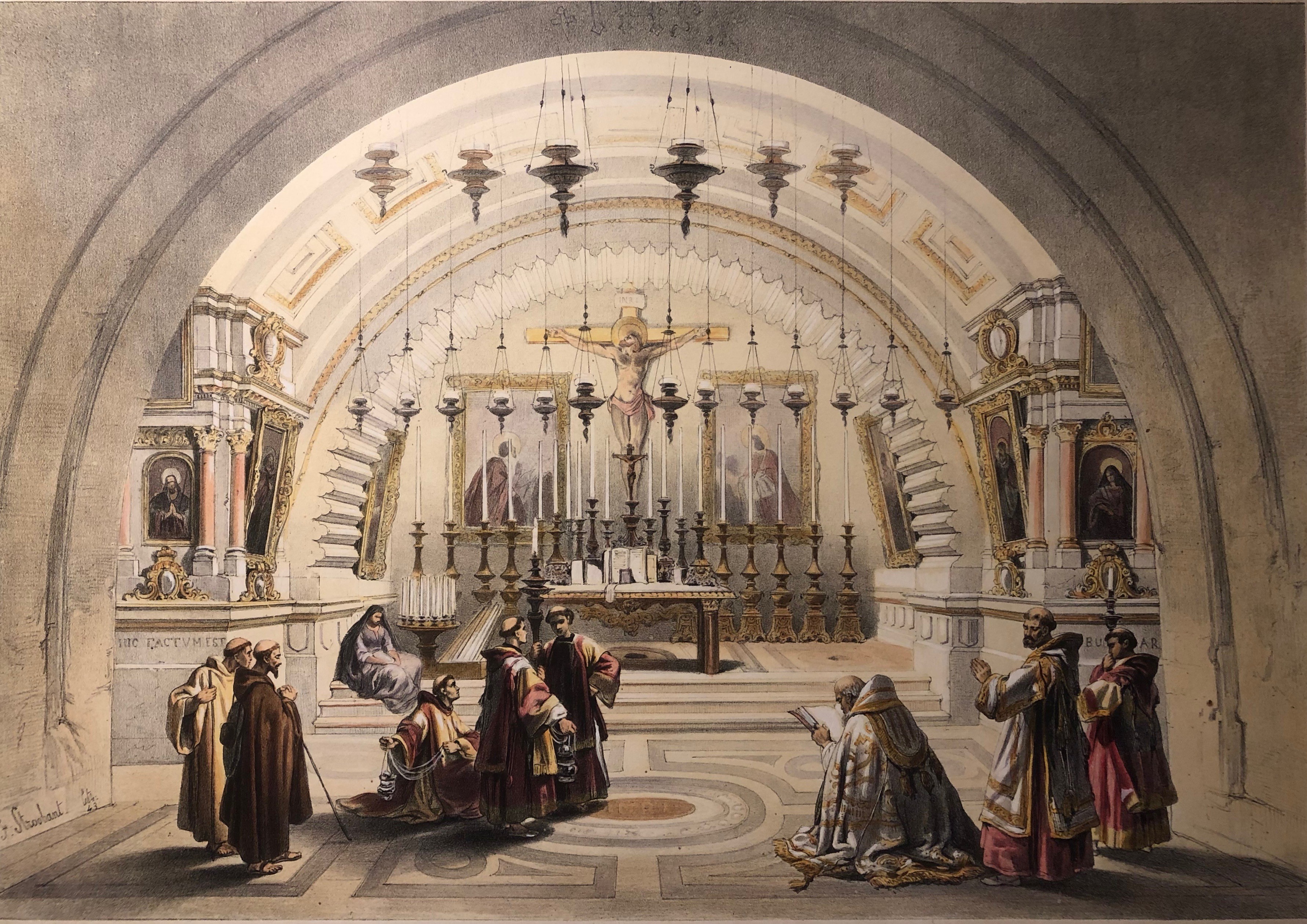 La Tere Sainte, Vues et Monuments is a set of Duo-tone lithographs done in 1852. The French were copying his images from his great set of lithographs (Views of Egypt, Nubia, and the Holy Land). To counter this he published this set of lithographs in Brussels. The images are identical to those in the English edition but in small folio form.