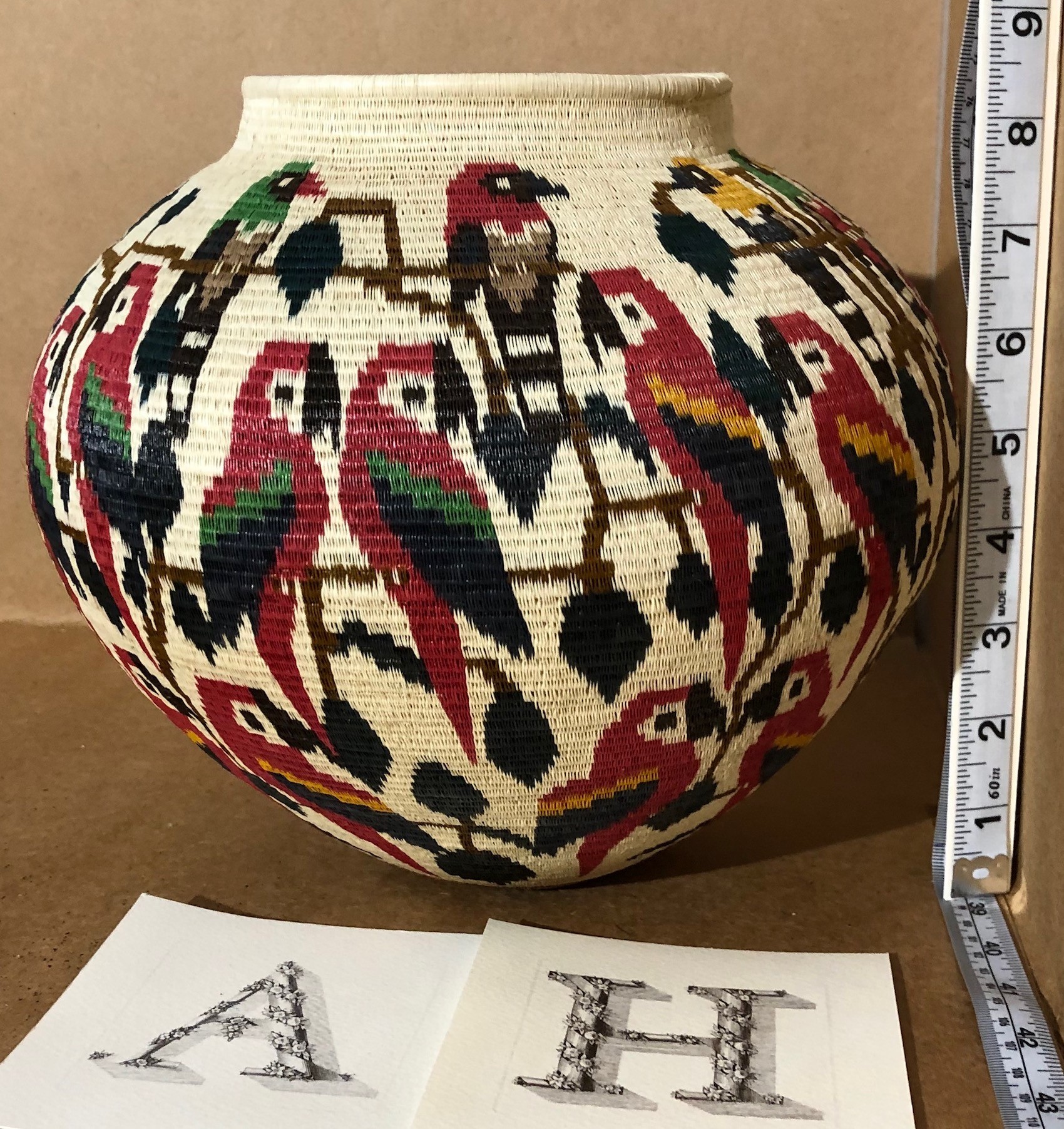 WOW! Thirty eight parrots and trogans are dramatically sitting on limbs in a rainforest of Panama. Many of the birds are Scarlet Maccaws. This is a tour de force achievement by the weaver. One of our best baskets this year.