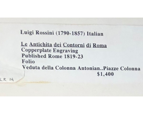 Liuig Rossini (1790-1857). Italian artist. Like Giovanni Battista Piranesi, Rossini focused on antique Roman Architecture and rendered in exquisite detail classical architecture of Rome and its surrounding countryside. This series of views was published between 1819-23 as "Le Antichita del Contorni di Roma" in Folio. His views are often mistaken as being done by Battista Piranesi. In contrast to Piranesi, he made greater use of the bucolic settings in his etchings of Roman ruins.