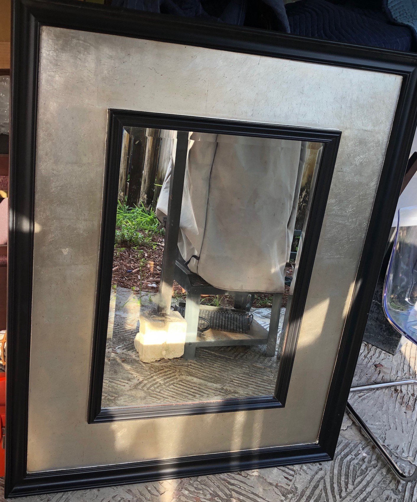 A large scale plate glass mirror with black silver gilt frame. 53 x 43 Inches or can be hung horizontally.
