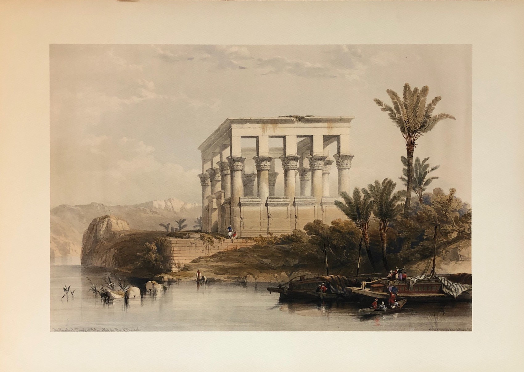 Views of Egypt, Nubia, and the Holy Land, Duo-Tone Lithograph with hand finishing. Published London 1842-49.  This set of 250 images of Egypt and the Holy Land was and is considered the greatest lithographic work of the 19th century.  Each image was first printed in b/w, then two additional printings were done in sepia, and blue or green, with several images printed a fourth time in red.  After printing, the images were hand finished by a team of water colour artists to bring the prints to a lifelike state.  If you ordered the set it would then take you 7 years to receive all 250 images.  At that time you would go to your bookbinder and have the prints bound as you wished.  The images have always been very desirable and are becoming very rare as sets are being broken and the prints sold off.