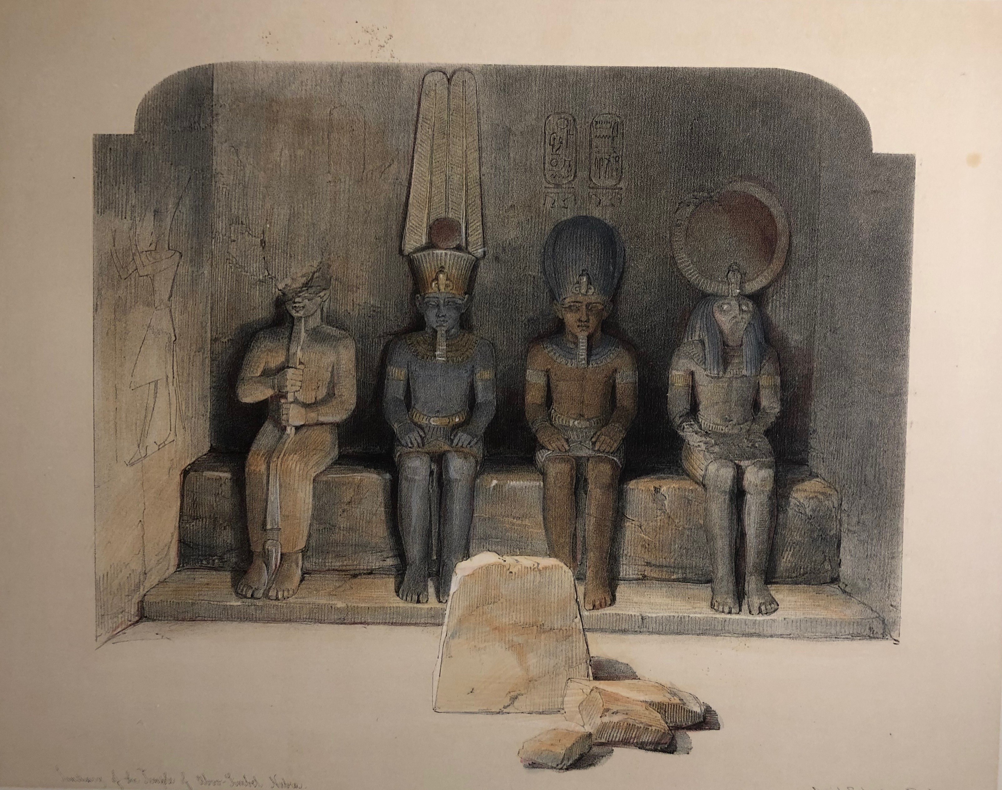 Views of Egypt, Nubia, and the Holy Land, Duo-Tone Lithograph with hand finishing. Published London 1842-49. This set of 250 images of Egypt and the Holy Land was and is considered the greatest lithographic work of the 19th century. Each image was first printed in b/w, then two additional printings were done in sepia, and blue or green, with several images printed a fourth time in red. After printing, the images were hand finished by a team of water colour artists to bring the prints to a lifelike state. If you ordered the set it would then take you 7 years to receive all 250 images. At that time you would go to your bookbinder and have the prints bound as you wished. The images have always been very desirable and are becoming very rare as sets are being broken and the prints sold off.