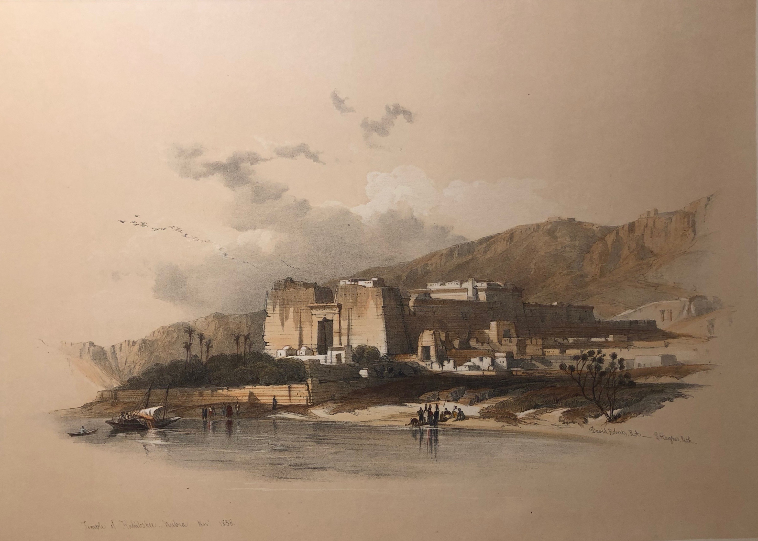 Views of Egypt, Nubia, and the Holy Land, Duo-Tone Lithograph with hand finishing. Published London 1842-49.  This set of 250 images of Egypt and the Holy Land was and is considered the greatest lithographic work of the 19th century.  Each image was first printed in b/w, then two additional printings were done in sepia, and blue or green, with several images printed a fourth time in red.  After printing, the images were hand finished by a team of water colour artists to bring the prints to a lifelike state.  If you ordered the set it would then take you 7 years to receive all 250 images.  At that time you would go to your bookbinder and have the prints bound as you wished.  The images have always been very desirable and are becoming very rare as sets are being broken and the prints sold off.