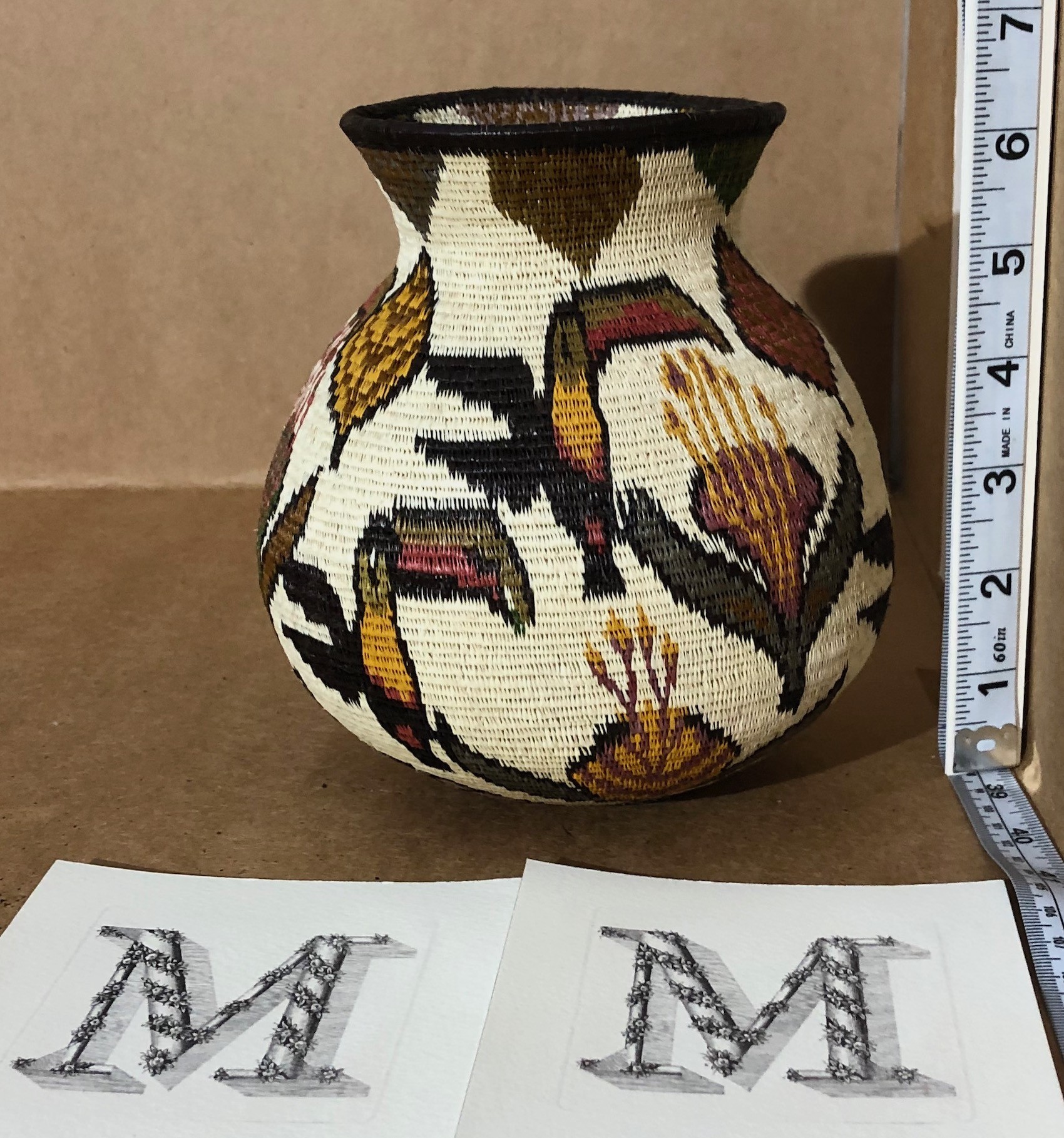 This is beautiful. Toucans and Lilies are shown all over the basket. Strong, bold, craftsmanship by a talented weaver. Great color.
