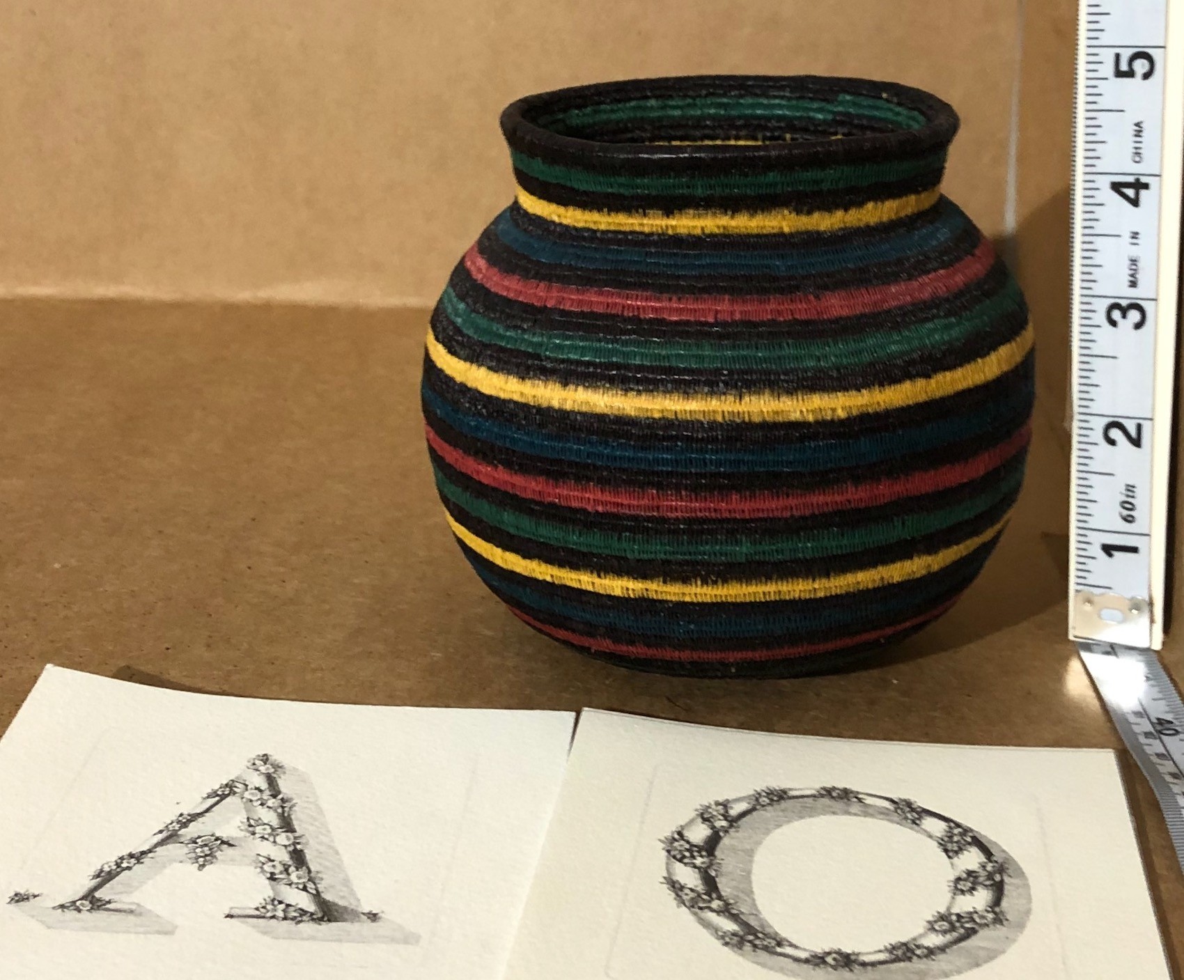 Very nice, simple traditional design basket of alternating bands of color- Blue, Black, Yellow, and red. A good size basket for the money and very good weaving.