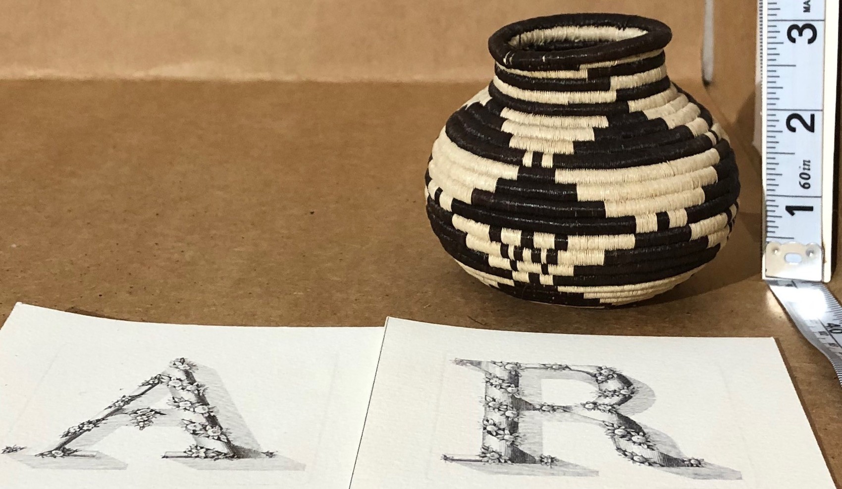 A very nice beginner basket with black and white triangles woven in the comb stitch. I keep paper clips in one similar to this one.