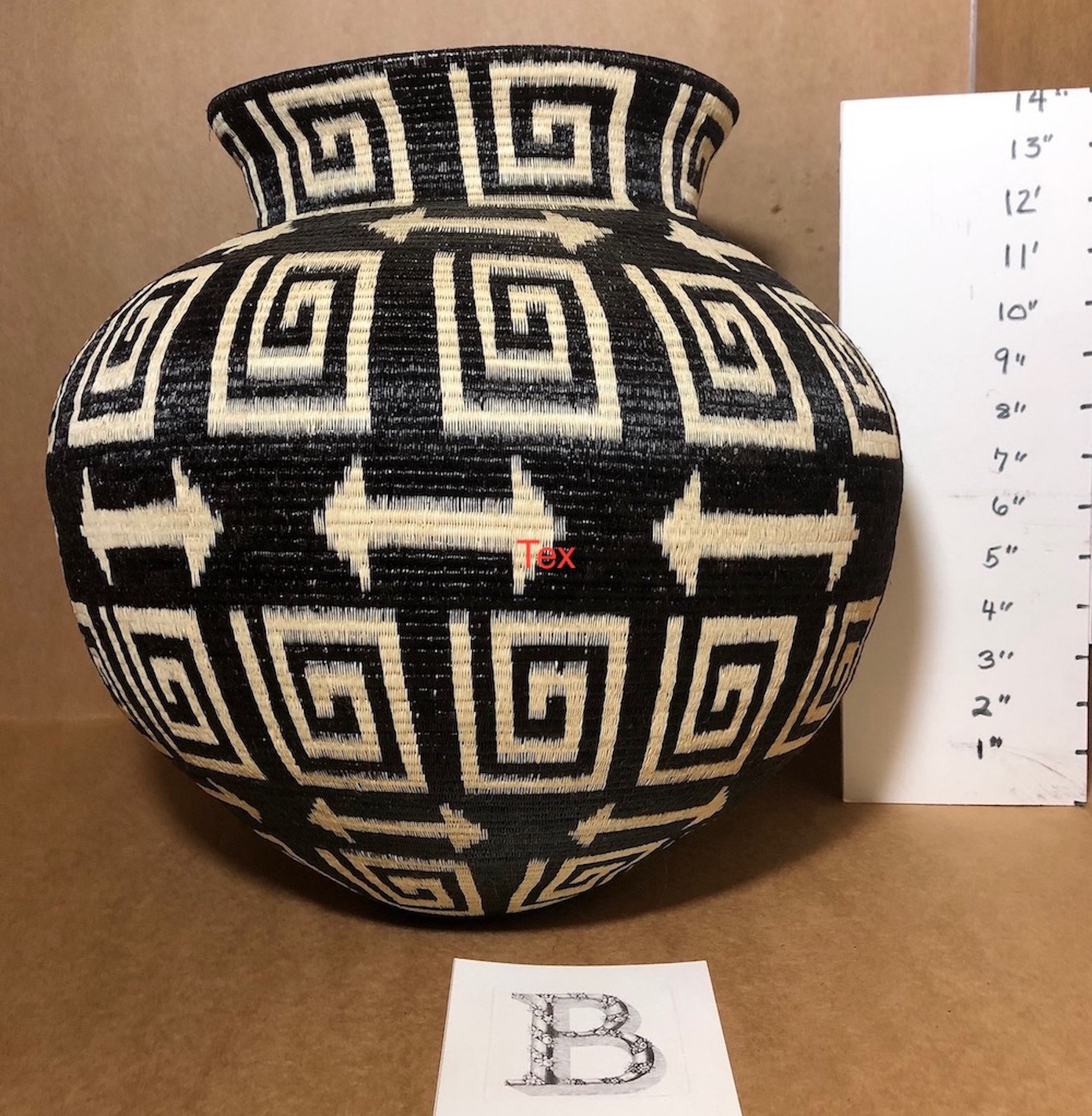 This is one of a pair of large, black and white traditional design hosig di baskets. This one with Greek key and double headed arrows. It is perfect with Basket A, the other traditional design black and white basket.