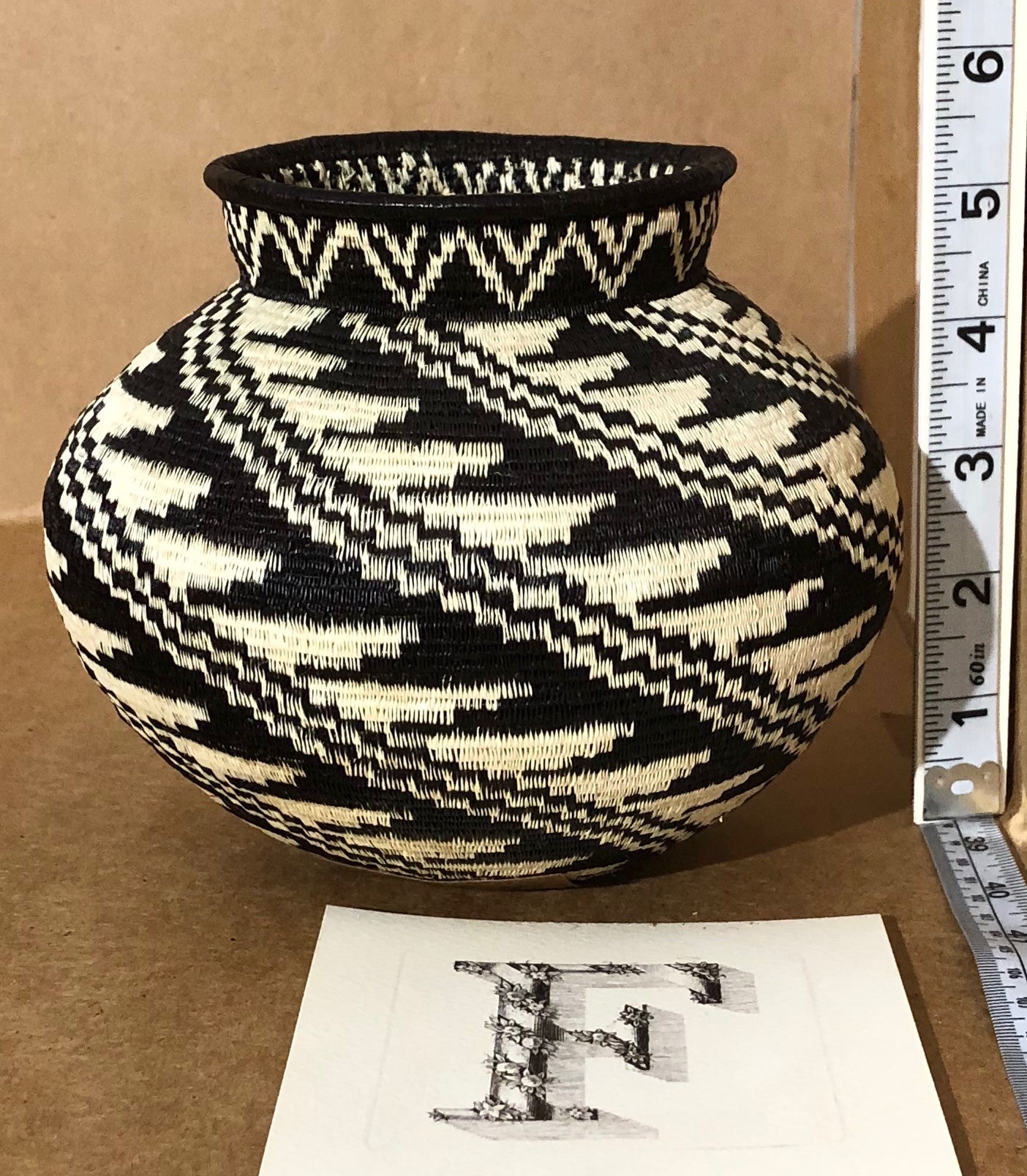 A great basket in black and white. Many Escalara baskets are quite simple. This one is intricate with alternating bands of staircase and railings. Finished in a simple chevron band in black and white. Lots of stitches to the inch. Quite fine.