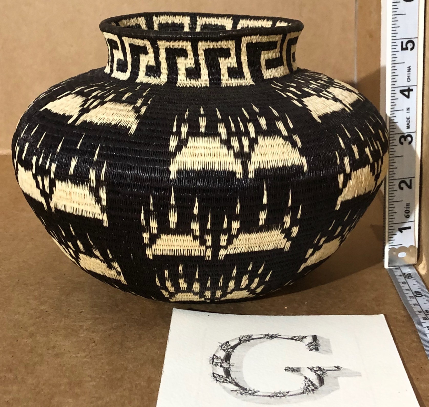 A dramatic black and white basket of Jaguar footprints covering the basket surface. Woven in groups of two and four alternating footprints stacked around the basket. A strong key pattern finishes the basket at the top. A good size basket as well.