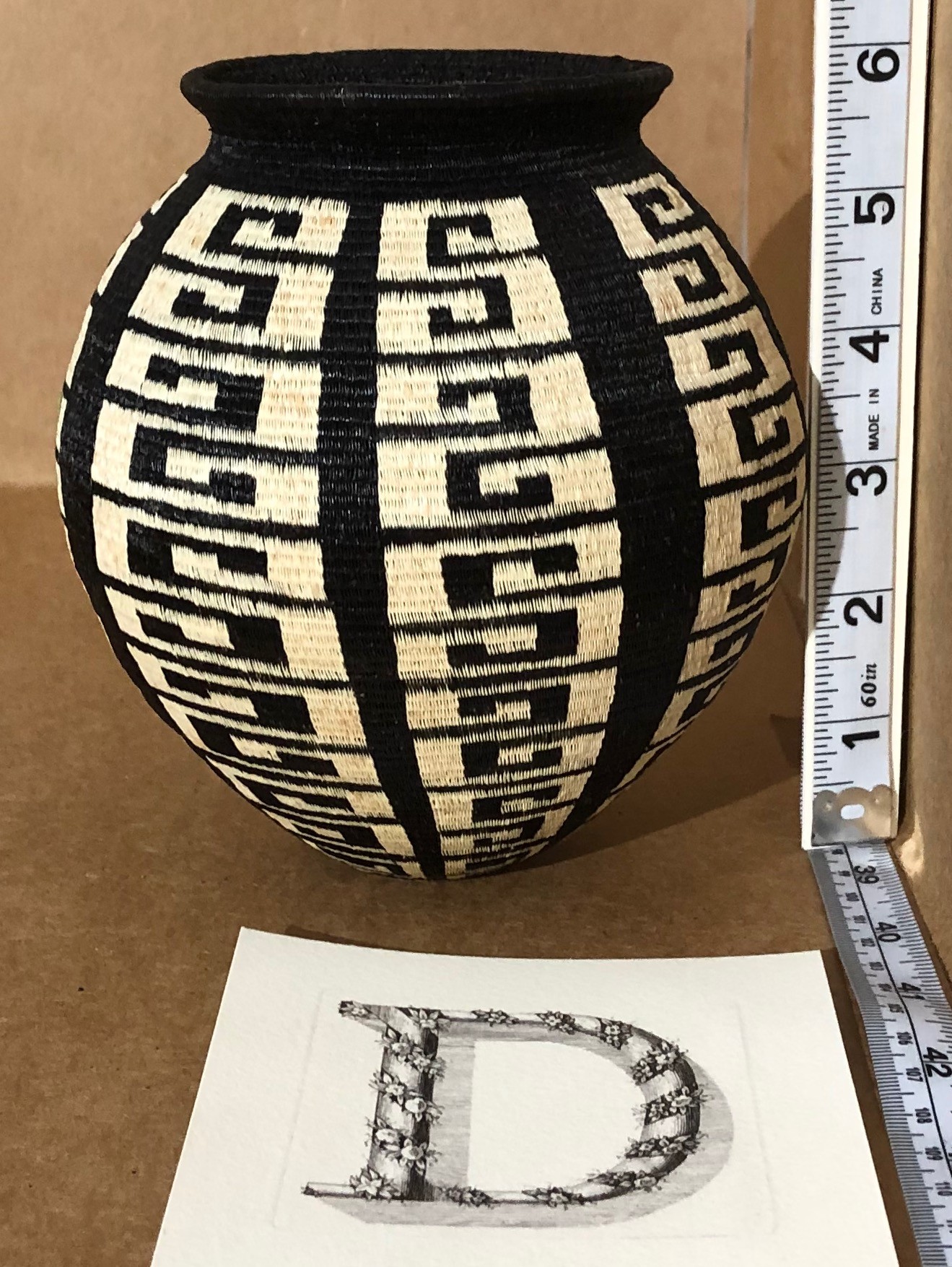 Simple, straightforward, traditional design of simplified keyed bands, stacked in an interlocking pattern. A most interesting and technical achievment by the weaver. This one belongs in any textile museum or collection of the finest baskets. DRAMATIC1