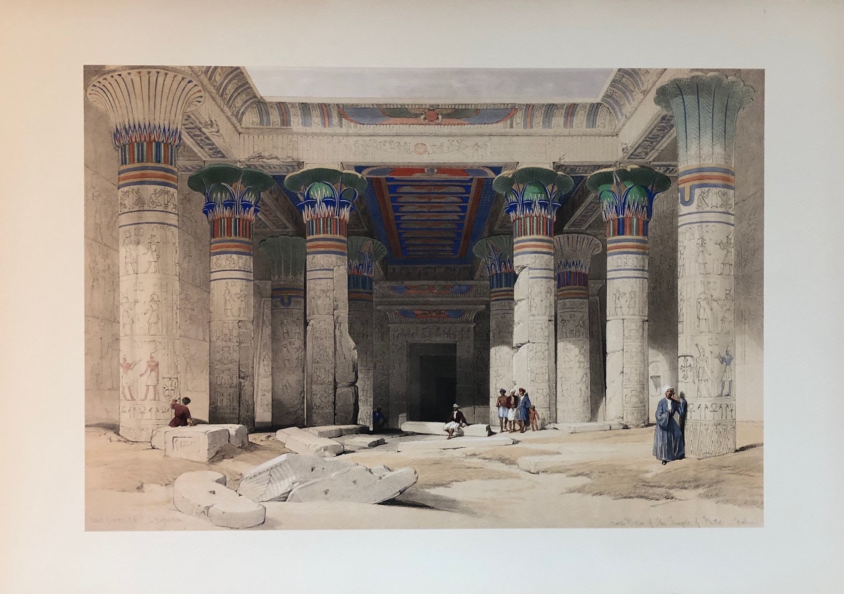Views of Egypt, Nubia, and the Holy Land, Duo-Tone Lithograph with hand finishing. Published London 1842-49. This set of 250 images of Egypt and the Holy Land was and is considered the greatest lithographic work of the 19th century. Each image was first printed in b/w, then two additional printings were done in sepia, and blue or green, with several images printed a fourth time in red. After printing, the images were hand finished by a team of water colour artists to bring the prints to a lifelike state. If you ordered the set it would then take you 7 years to receive all 250 images. At that time you would go to your bookbinder and have the prints bound as you wished. The images have always been very desirable and are becoming very rare as sets are being broken and the prints sold off.