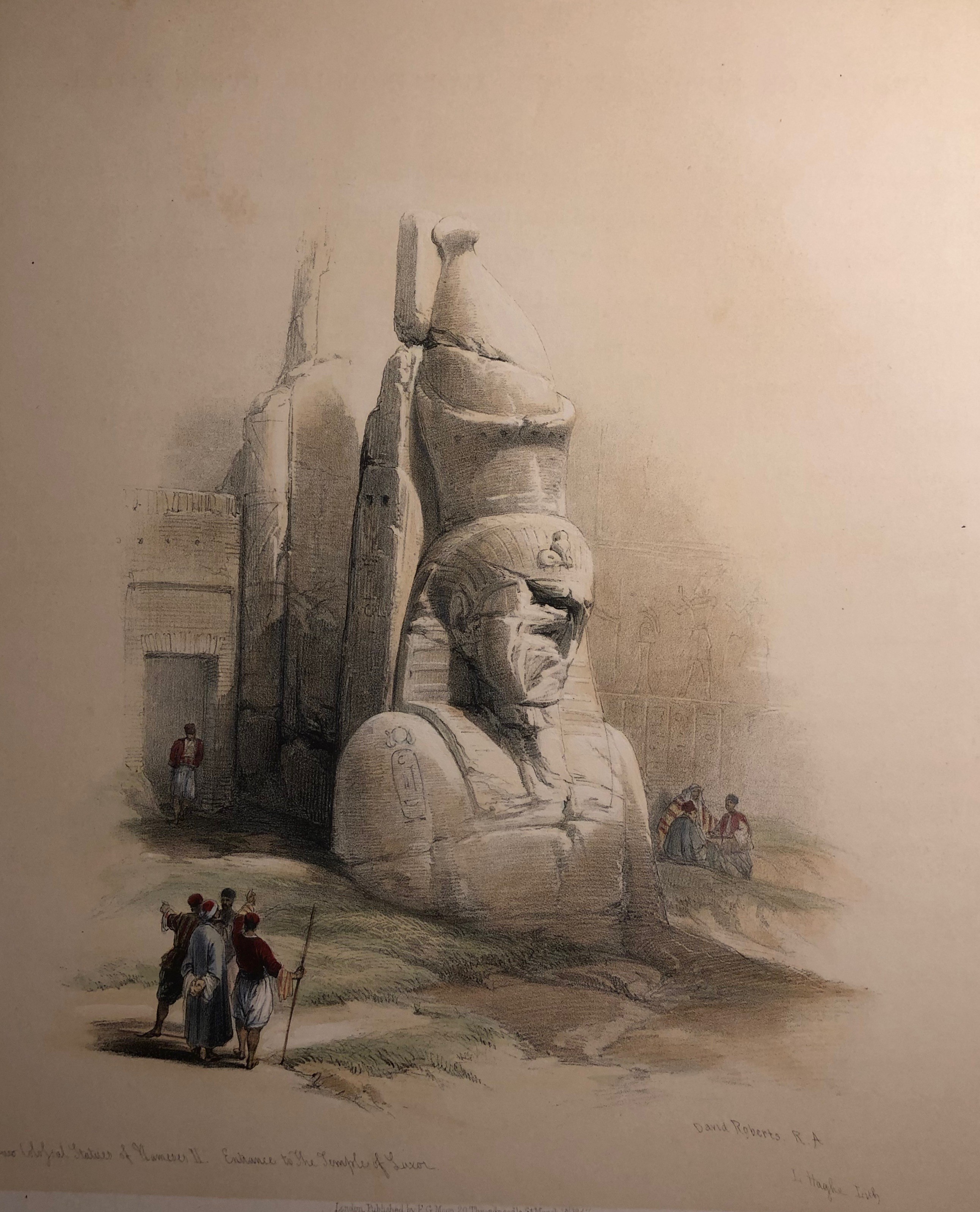 Views of Egypt, Nubia, and the Holy Land, Duo-Tone Lithograph with hand finishing. Published London 1842-49.  This set of 250 images of Egypt and the Holy Land was and is considered the greatest lithographic work of the 19th century.  Each image was first printed in b/w, then two additional printings were done in sepia, and blue or green, with several images printed a fourth time in red.  After printing, the images were hand finished by a team of water colour artists to bring the prints to a lifelike state.  If you ordered the set it would then take you 7 years to receive all 250 images.  At that time you would go to your bookbinder and have the prints bound as you wished.  The images have always been very desirable and are becoming very rare as sets are being broken and the prints sold off.