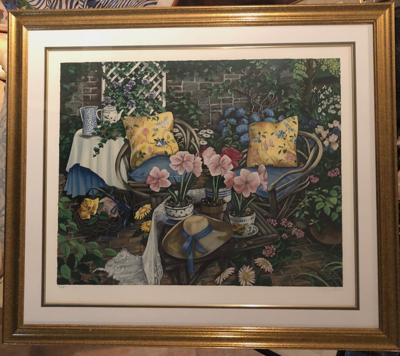 Susan Rios, born in 1950, is a widely collected artist from Indiana now working in southern California. Her works use strong and vivid color portraying intimate settings of everyday life. This serigraph is entitled "Amaryllis". Numbered 79 of 295. A large 47 inch by 52 inches sisght size. Expertly matted and framed. Signed L.R. and numbered L.L. 79/295