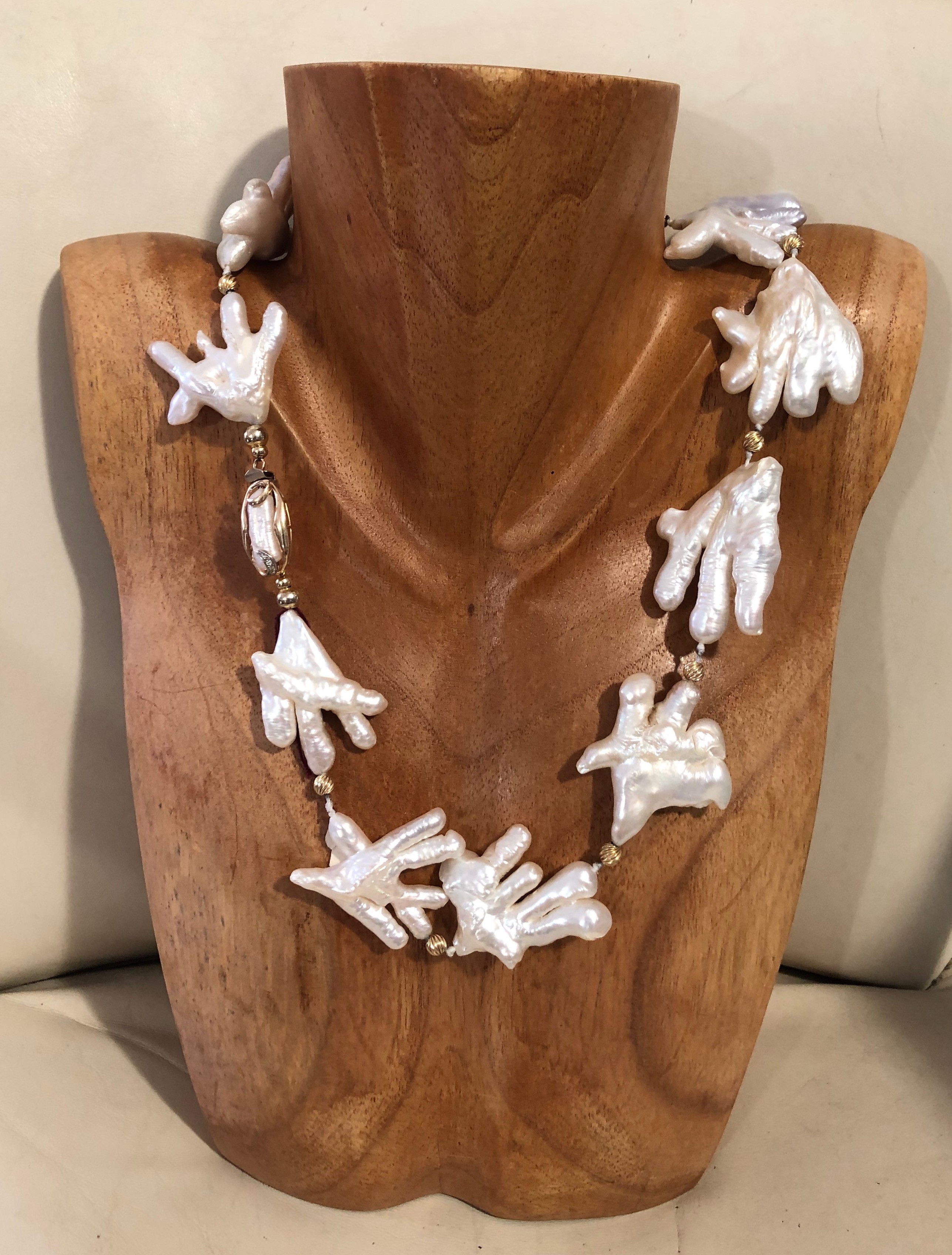 A lovely 22" long strand of Branch Pearls with 14K gold rondels and a 14K gold clasp with baroque pearl and diamond. $3,200