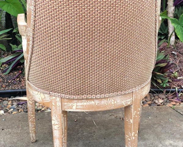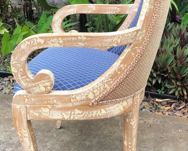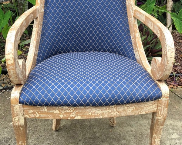 Sold as a SET only, six crackle finish chaire with blue fabric in great condition. A statement set for your dining room. Call us for shipping or delivery zones