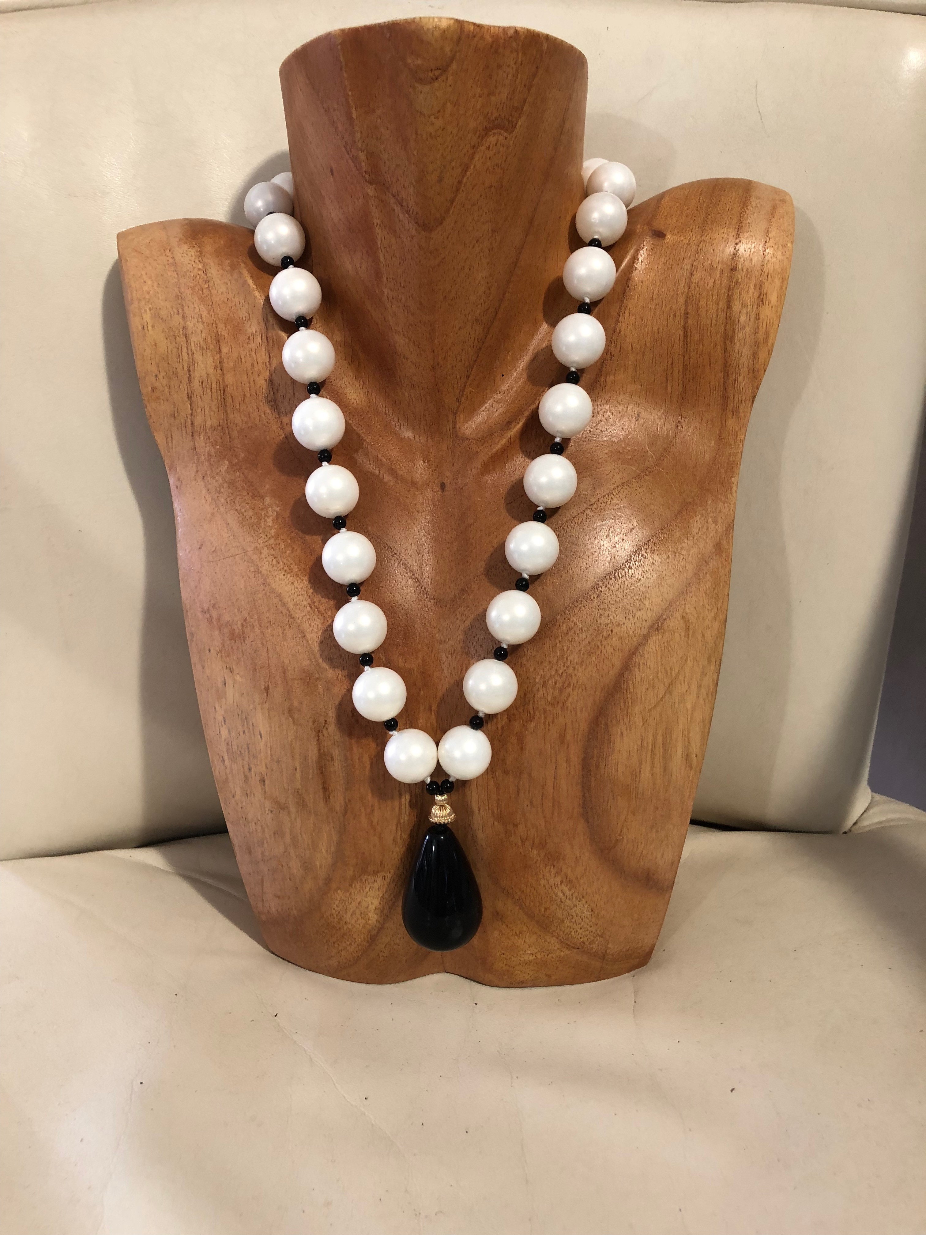 A lovely 24" strand of faux conch pearls with a 32 MM Onyx teardrop. $425