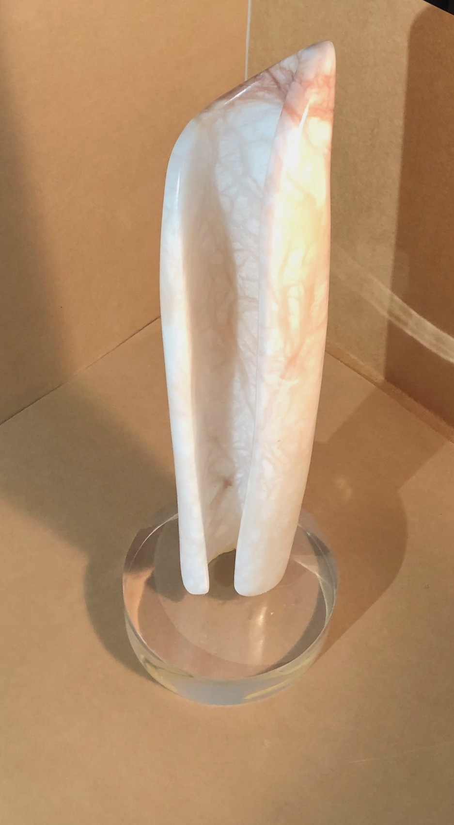 Folded Column is of rose and white agate mounted on a lucite base. 24 1/2" tall.