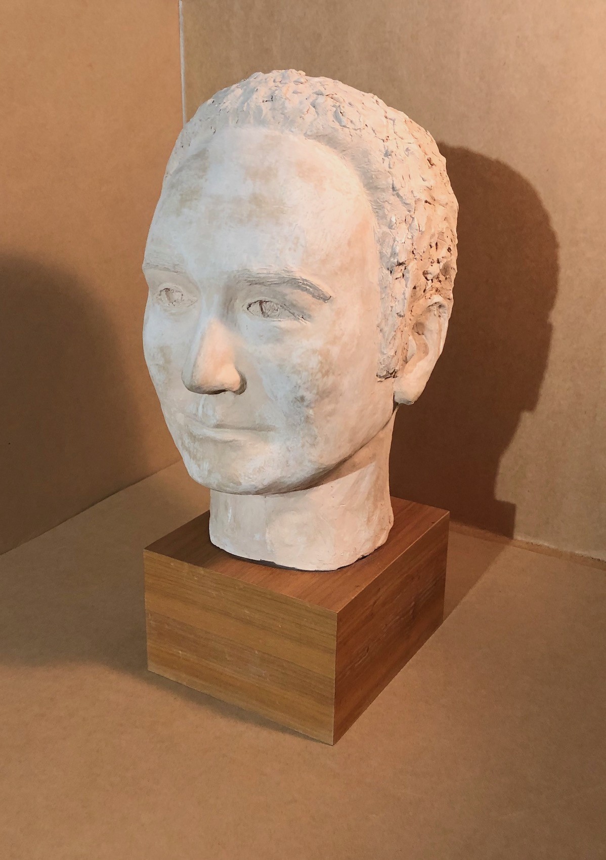A bisque fired sculpture of an aristocratic gentleman on a wooden base. 15" tall.