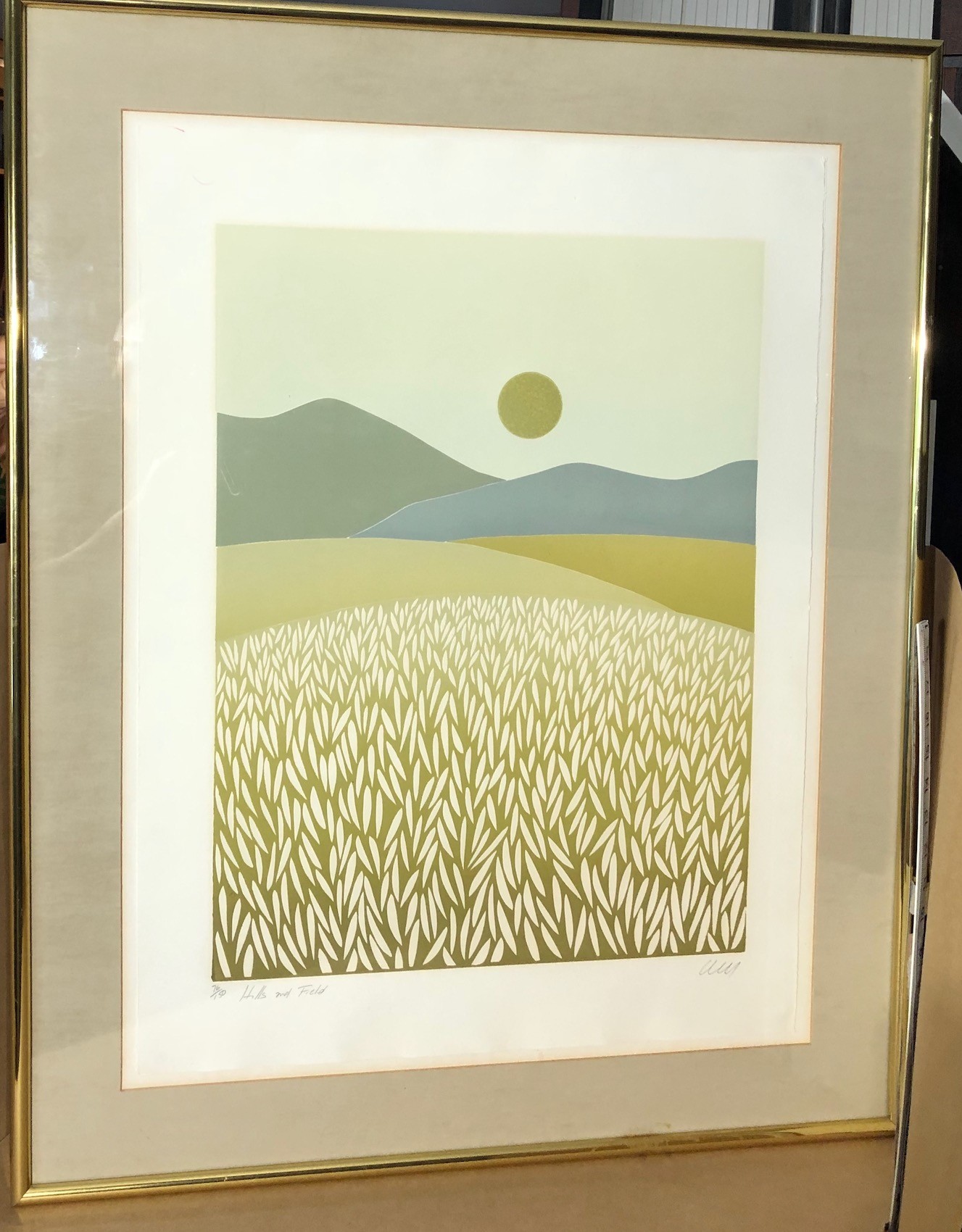 A nice, brightly colored serigraph from the mid 1960's. #76 of 150. 29 x 22 inches. Signed L.R. illegible. Will be great in any modern setting. Framed. Floated on mat.