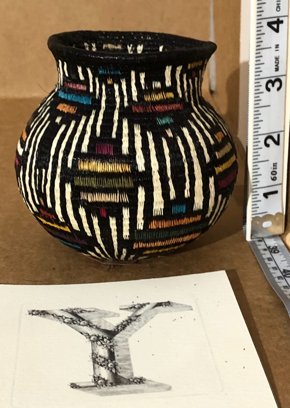 A brightly colored traditional basket with lozenges of gold, yellow, white, and red bands spread over a black and white striped ground. A nice smaller basket. Dramatic.