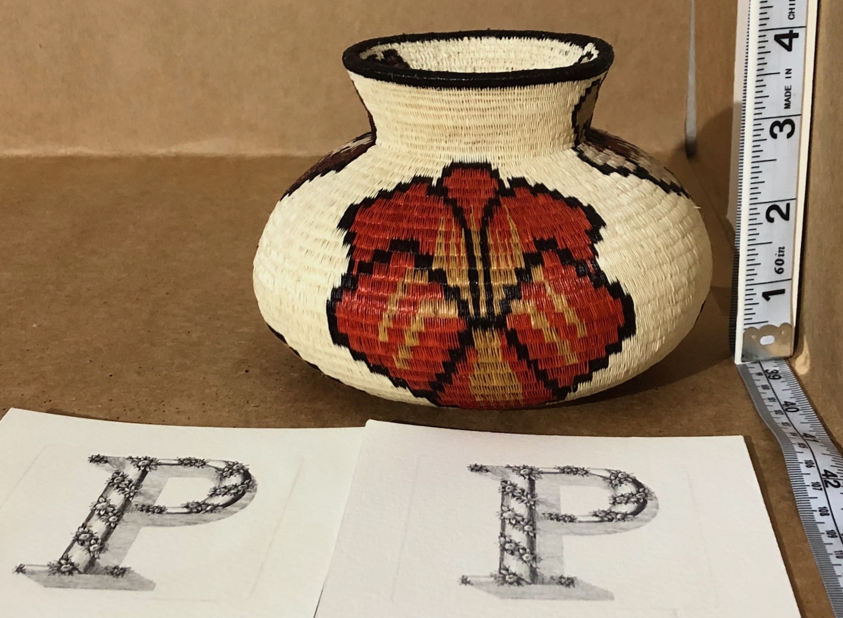 A very nice smaller basket with many lilies spread around the ground of the basket. Primarily in Red and Yellow it is a beautifully laid out design. Simple and direct and skillfully woven. Even a better price.