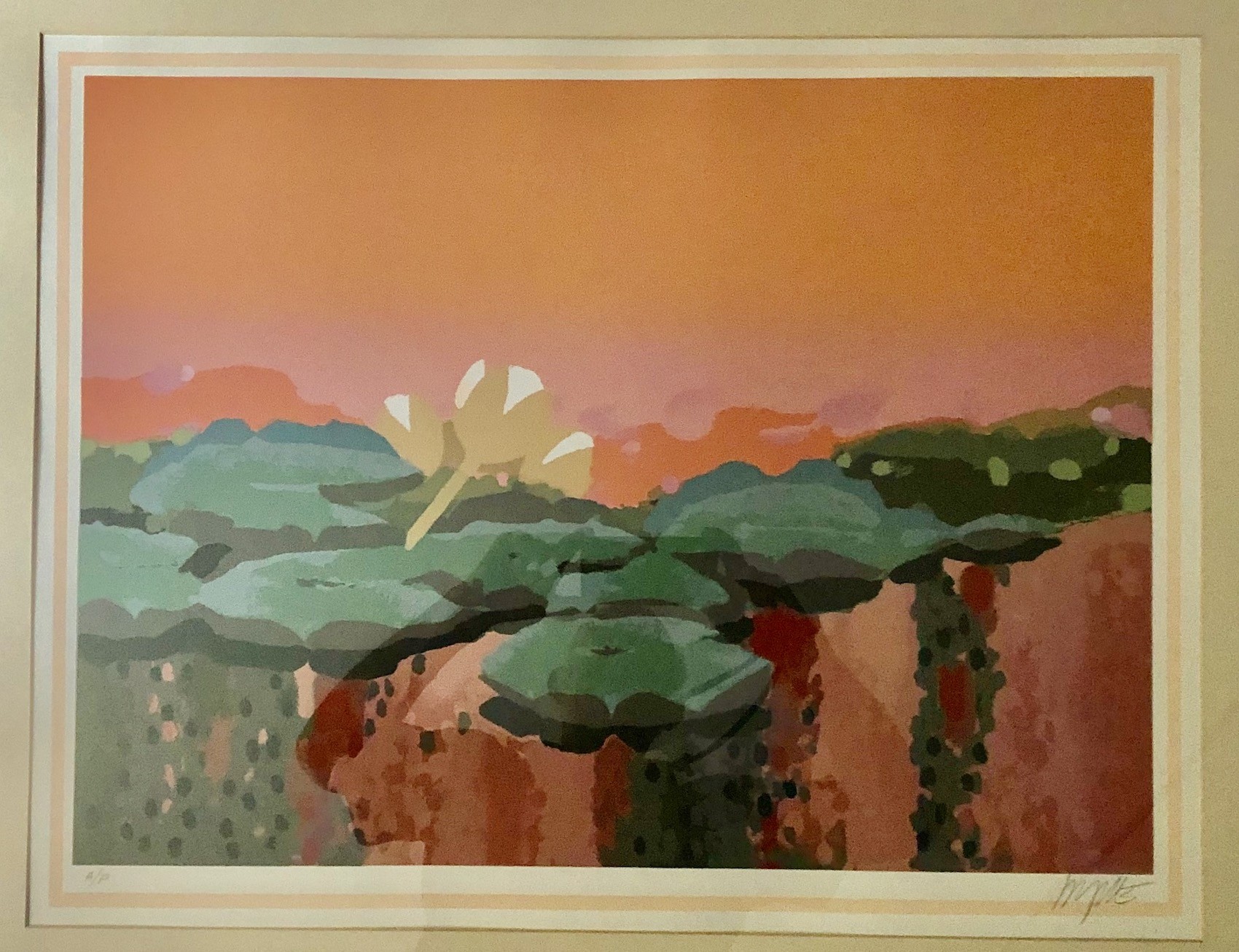 An impressionist depiction of a lily pond in bloom. Serigraph. Artist Proof. C. 1970. Signature illegible. Framed. Overall size 29 x 35 1/2 inches.