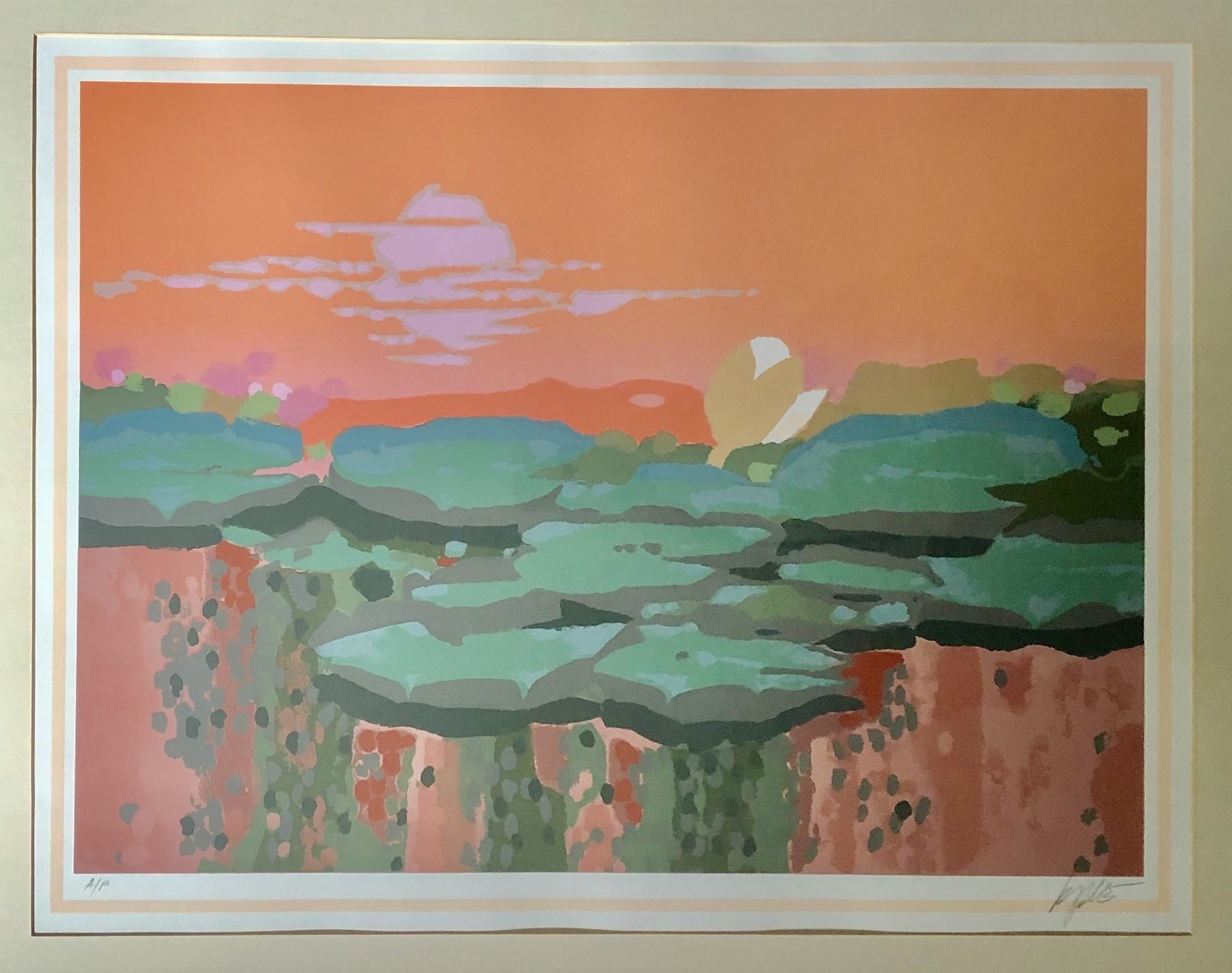 An impressionists depiction of a lily pond in bloom. Serigraph. C. 1970. Artist Proof. Signature illegible. Framed. Overall size 29 x 35 1/2 inches.
