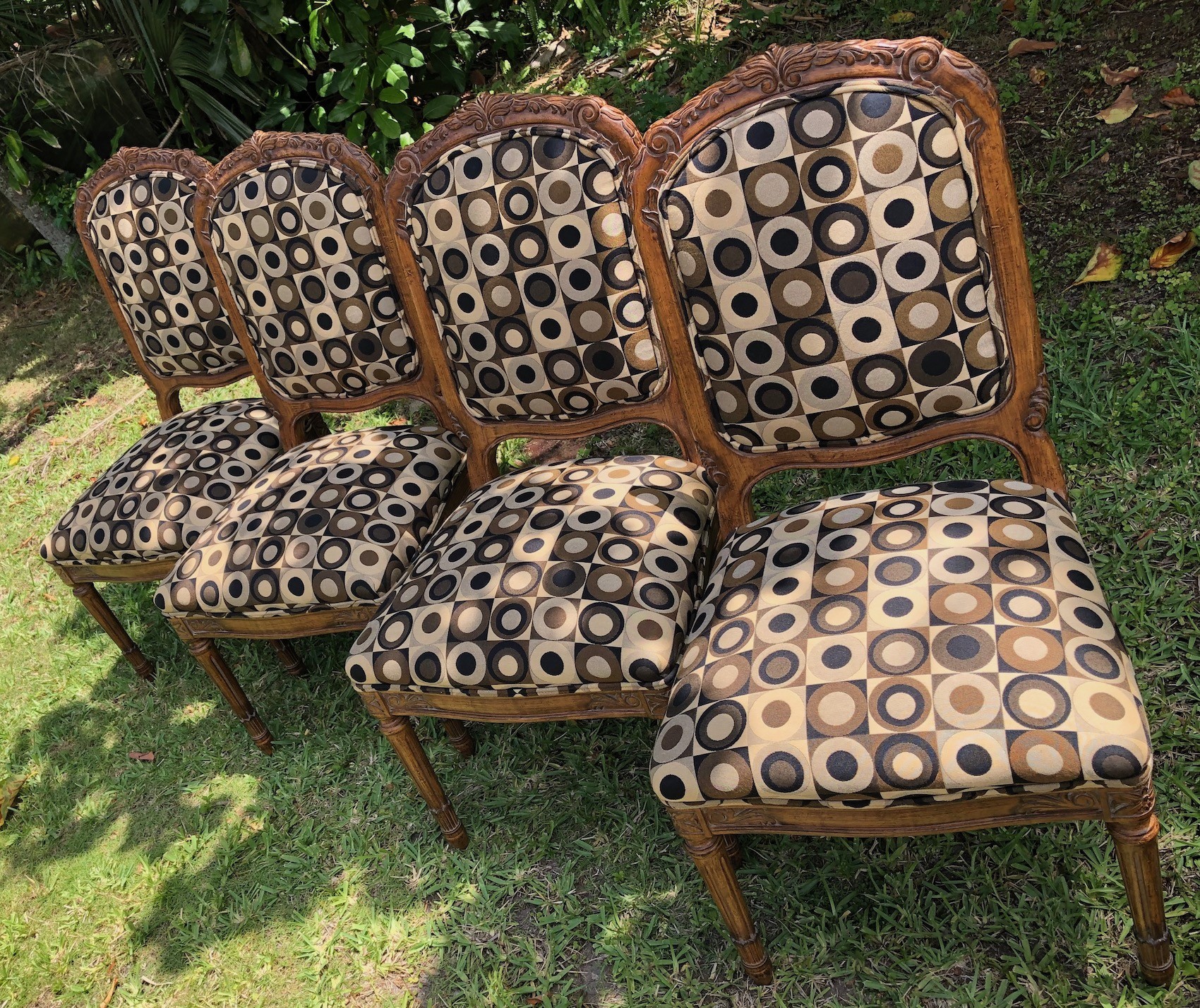 Just arrtived!! A wonderful set of four side chairs by Louis Solomon, NYC. Nicely carved sides, back, and legs. C. 1980's. The set of four is $800