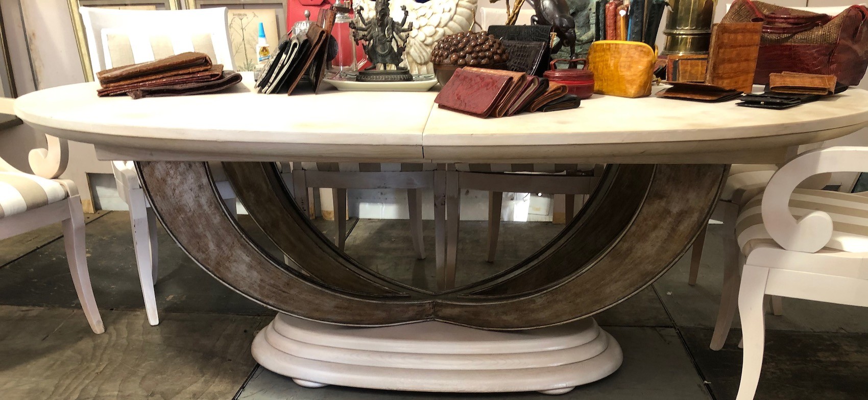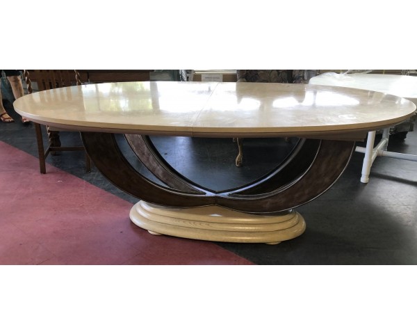 Beautiful oval dining table with two leaves on a brushed metal flaired base. Striking design.