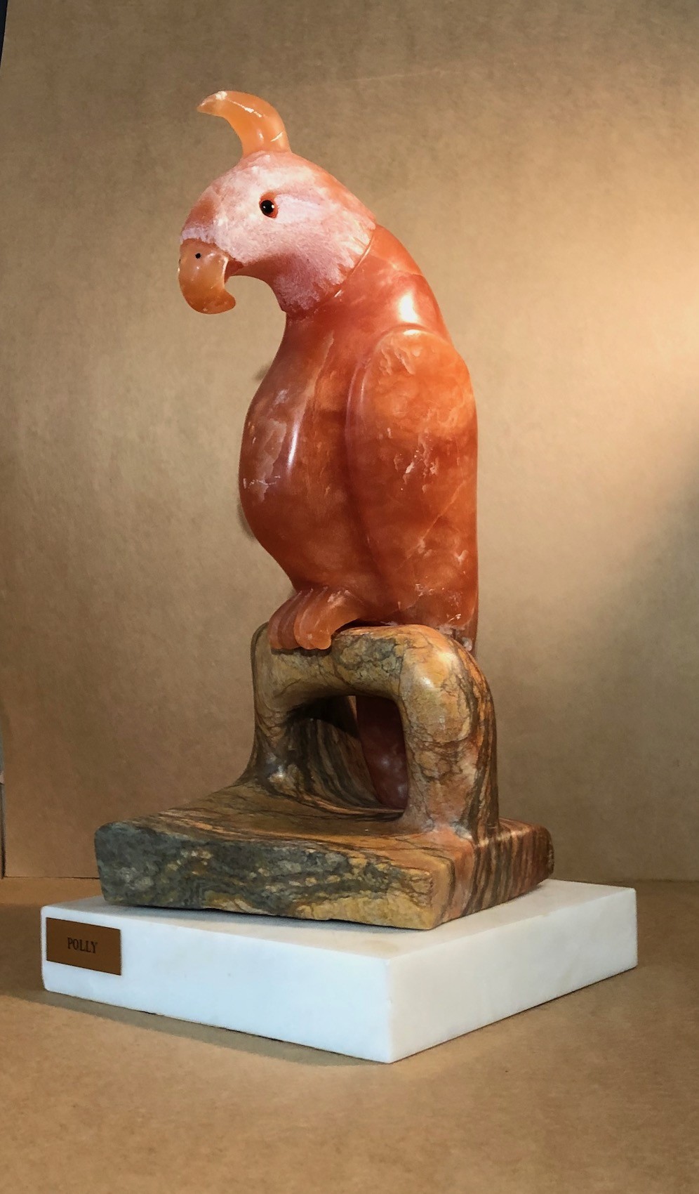 Red agate on red marble perch mounted on Carrara Marble base. This is one of Cecilias most detailed pieces. She has carefully chosen to place her carving details correctly as directed by the coloring of the stone. Notice the crown of the parrot and Polly's head on the base of the body. The coloring of the material follows the carving of the figure. 21" tall. In two pieces-Parrot and Perch.