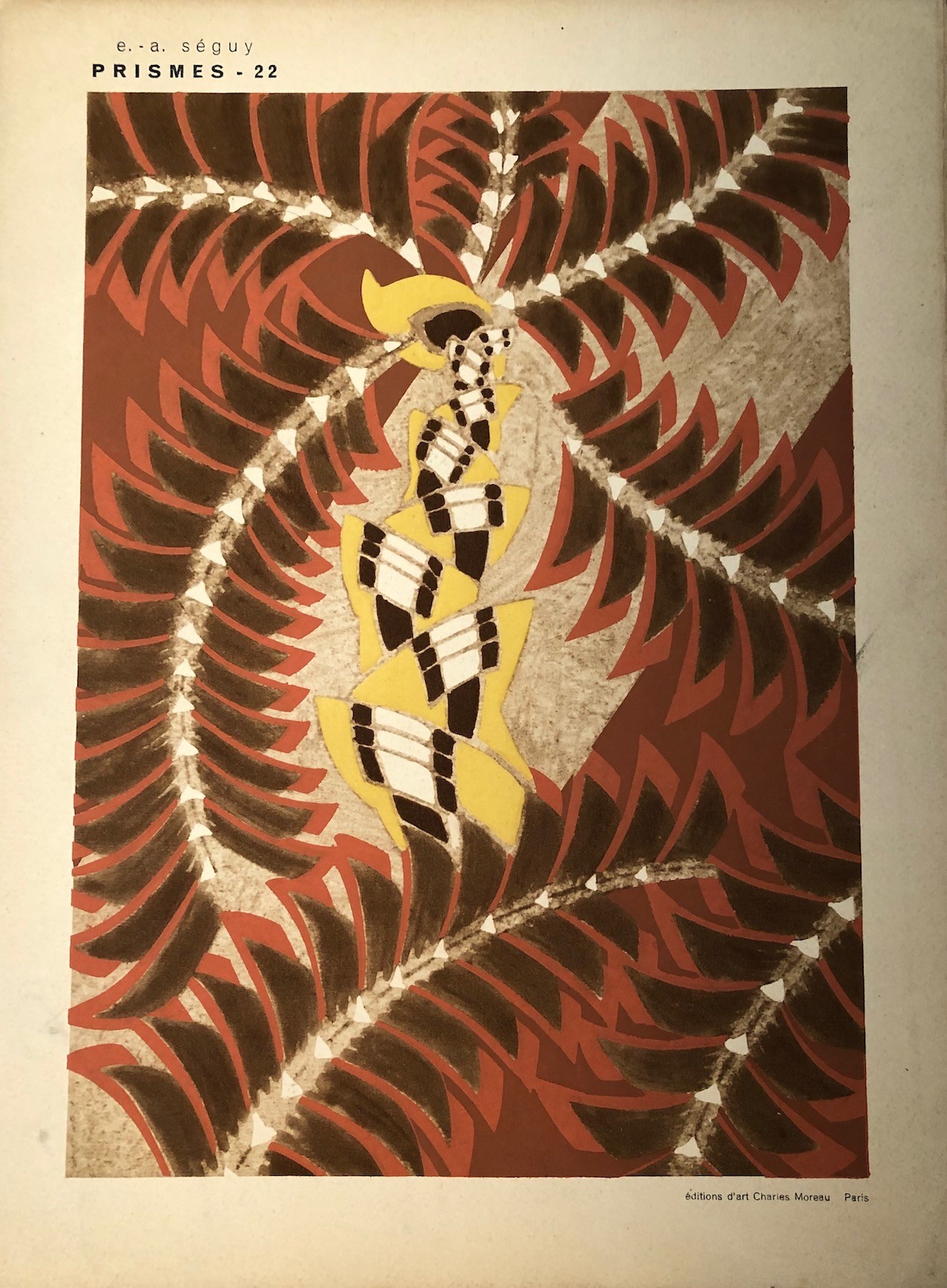 The designs contain abstract, geometric, and semi-abstract motifs many of which are of natural subjects.  Brilliant colour and bold motifs characterize Seguy’s work.