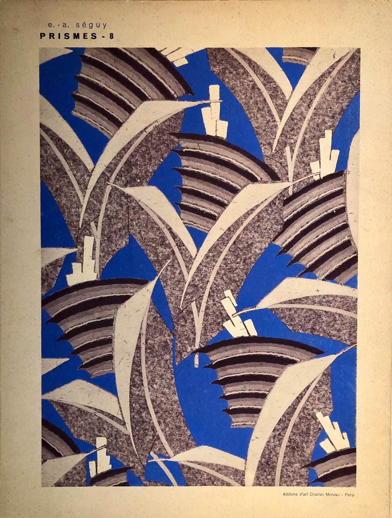 This design from a collection of Prismes: 40 Planches de Designs et Coloris Nouveaux with Art Deco designs.  Seguy worked in Pochoir which is a stencil printing process with each colour using a separate stencil.  A very time consuming and exacting process that was only used commercially for around ten years.  It was too expensive to be used for large scale printing projects.  It is still used today in fine arts applications.
