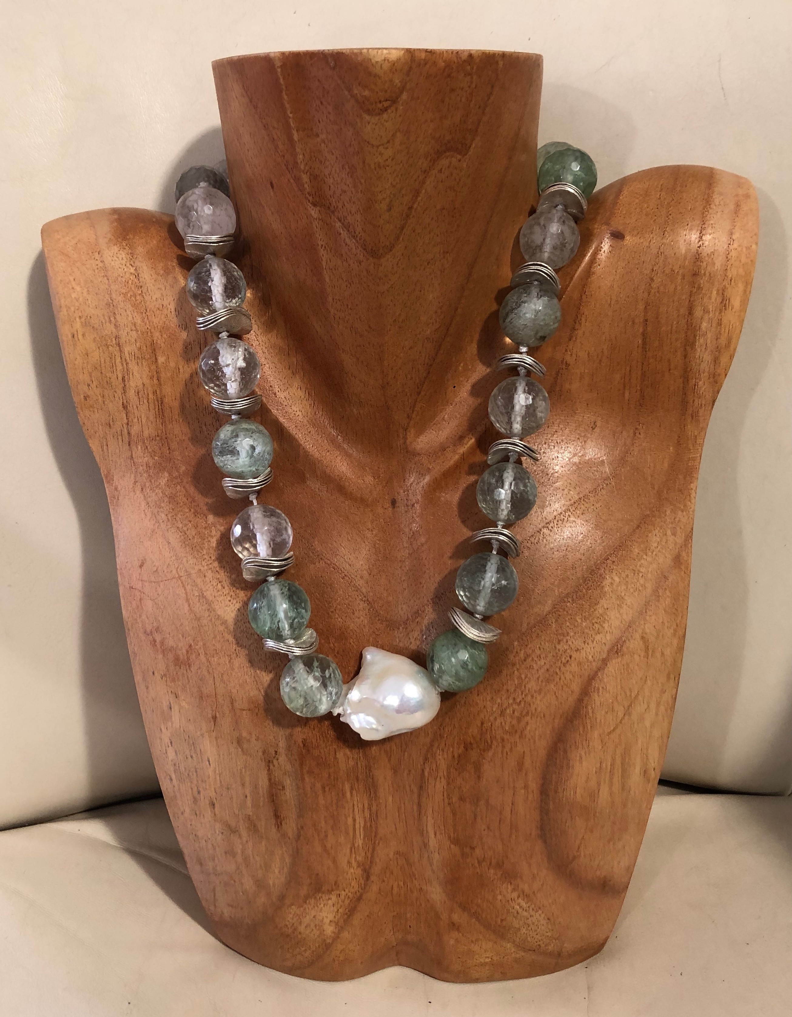 A lovely 20" strand of Rock Chrystal with a 22 mm pearl and a sterling silver clasp. Offered at $325