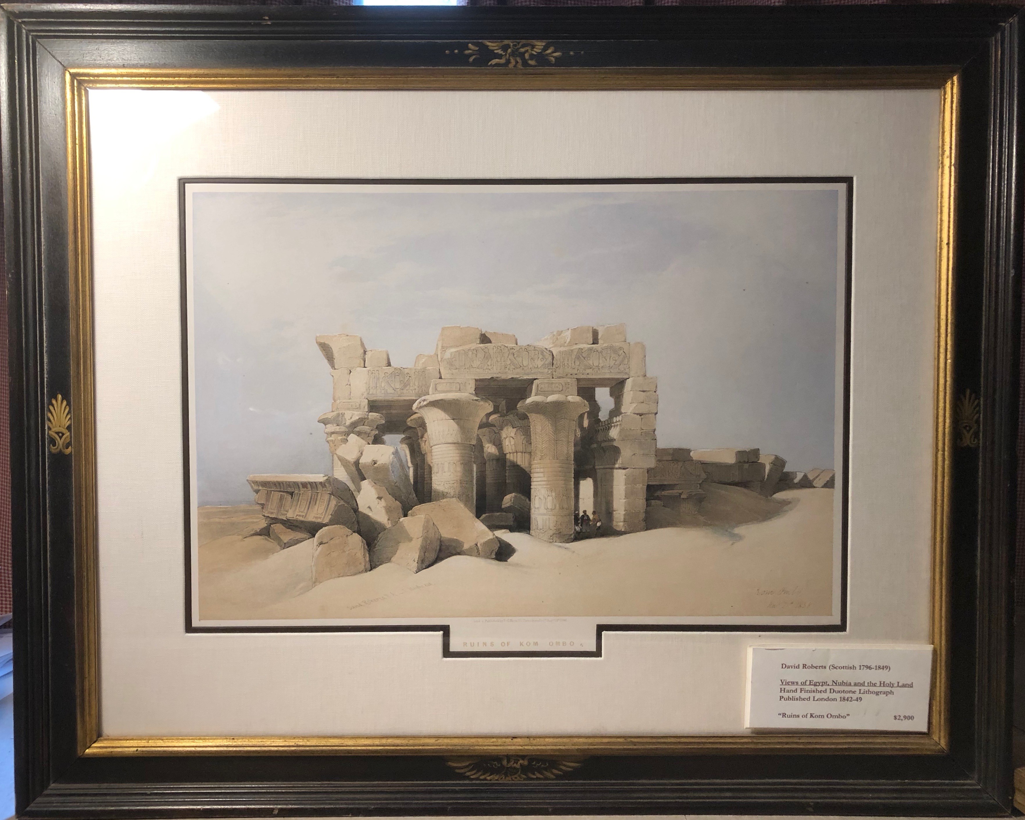 Views of Egypt, Nubia, and the Holy Land, Duo-Tone Lithograph with hand finishing. Published London 1842-49.  This set of 250 images of Egypt and the Holy Land was and is considered the greatest lithographic work of the 19th century.  Each image was first printed in b/w, then two additional printings were done in sepia, and blue or green, with several images printed a fourth time in red.  After printing, the images were hand finished by a team of water colour artists to bring the prints to a lifelike state.  If you ordered the set it would then take you 7 years to receive all 250 images.  At that time you would go to your bookbinder and have the prints bound as you wished.  The images have always been very desirable and are becoming very rare as sets are being broken and the prints sold off.