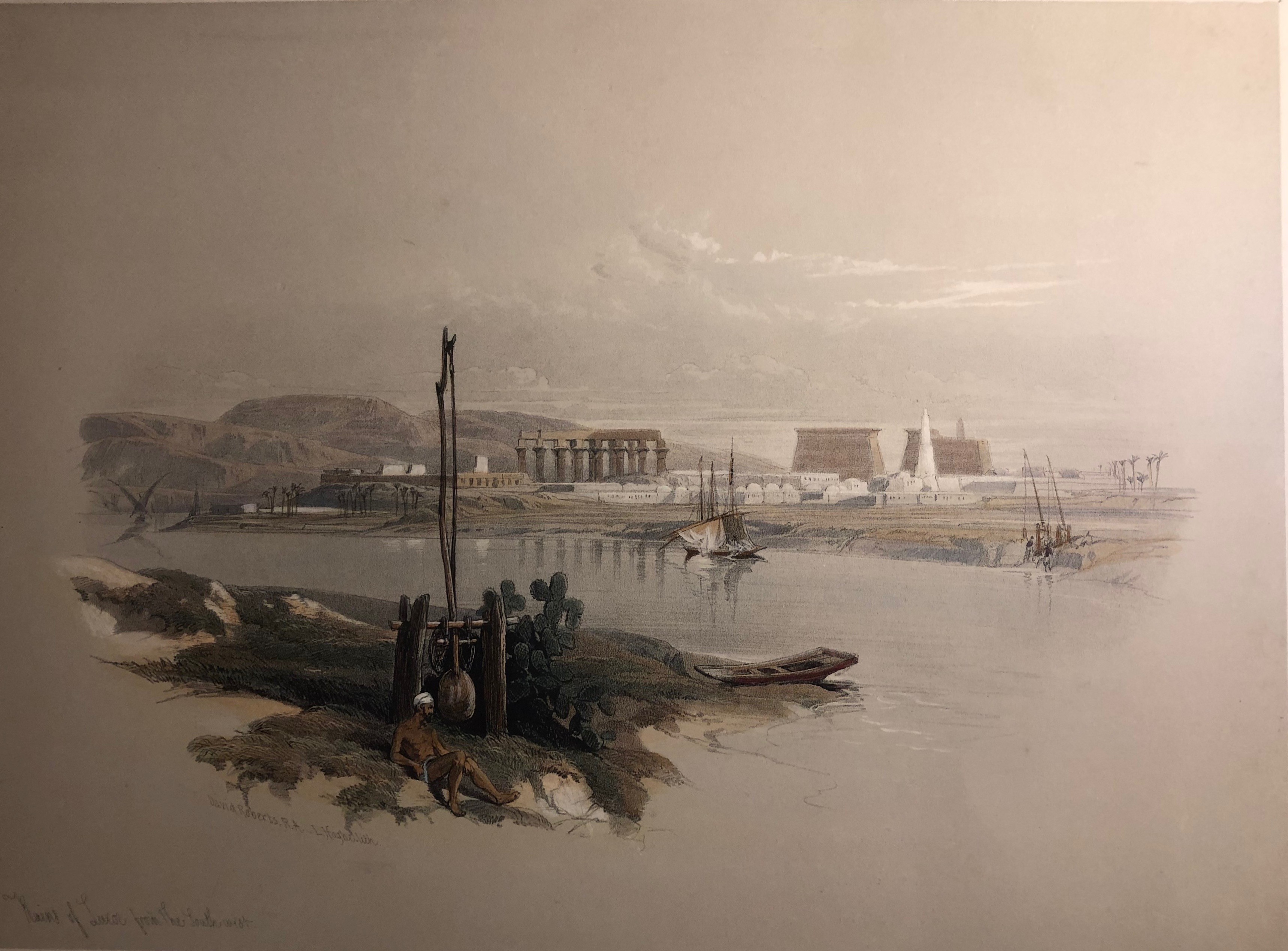 Views of Egypt, Nubia, and the Holy Land, Duo-Tone Lithograph with hand finishing. Published London 1842-49. This set of 250 images of Egypt and the Holy Land was and is considered the greatest lithographic work of the 19th century. Each image was first printed in b/w, then two additional printings were done in sepia, and blue or green, with several images printed a fourth time in red. After printing, the images were hand finished by a team of water colour artists to bring the prints to a lifelike state. If you ordered the set it would then take you 7 years to receive all 250 images. At that time you would go to your bookbinder and have the prints bound as you wished. The images have always been very desirable and are becoming very rare as sets are being broken and the prints sold off.