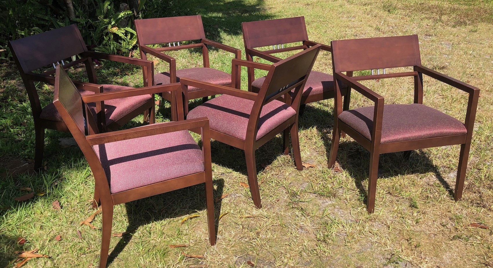 A set of six wooden arm chairs with drop seats. 19 inches wide and 22 inches deep. The arms are 26" off of the floor. A nice set in good condition. $400 for the set.