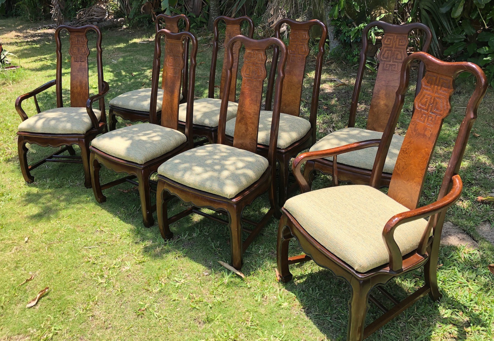 A very nice set of 4 side and 2 arm chairs in a modern Chinese design. They all have tight joints and have been gently used. Made of mahogany from the Phillipines.