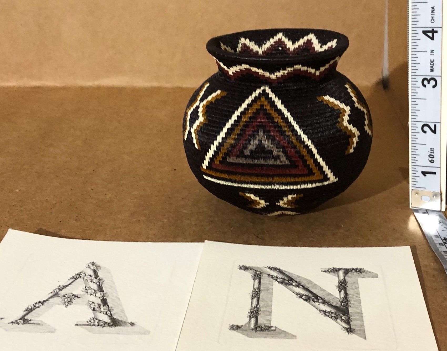 A museum piece!! Not large, just perfect. Very fine stitches not seen often in hosig di baskets. It takes too long to make a fina basket. This one is of triangles and chevrons on a black background. For collectors of the finest baskets.